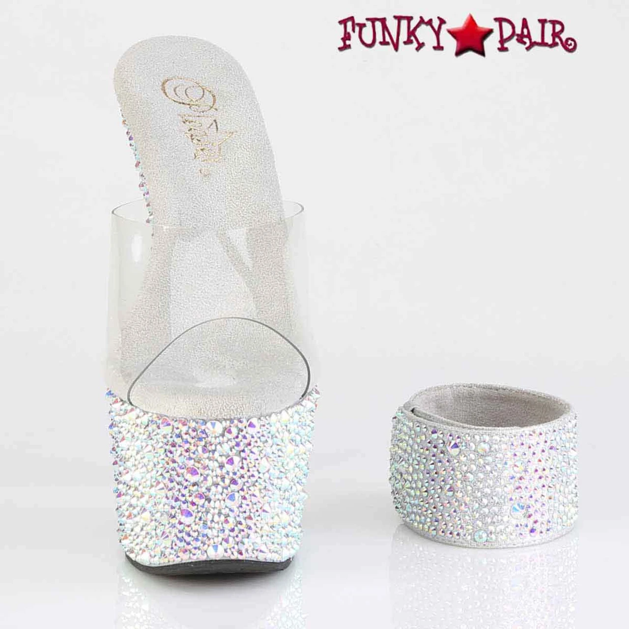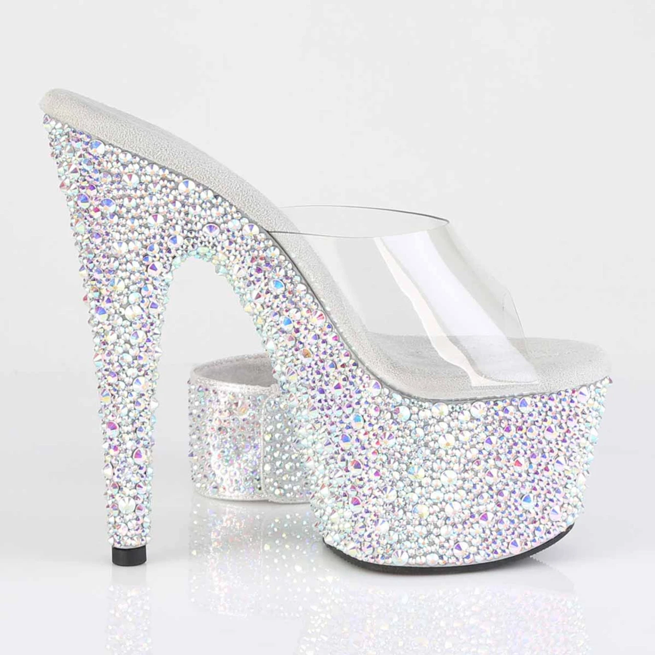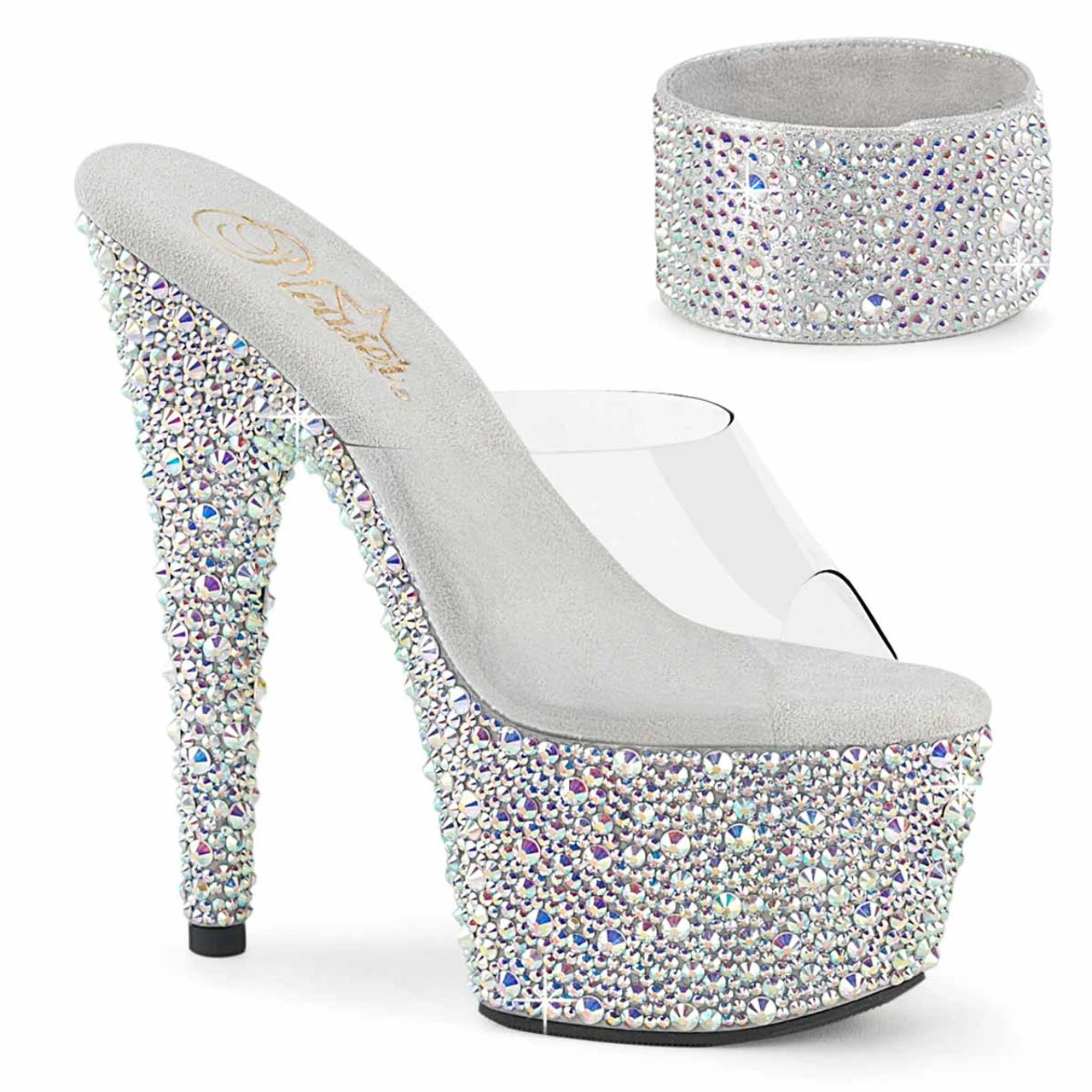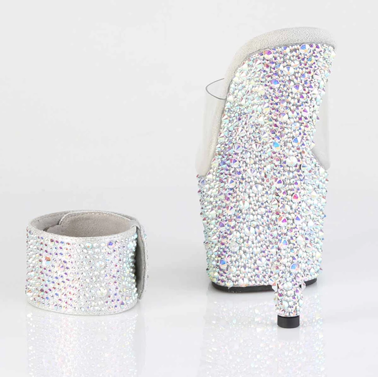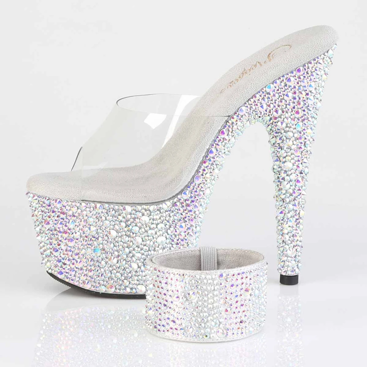 7″ (178mm) Heel, 2 3/4″ (70mm) Platform Slide Featuring Multi Sized Rhinestones Encrusted on the Entire Platform Bottom. Includes a Pair of 1 3/4″ (45mm) Matching Adjustable Ankle Cuffs