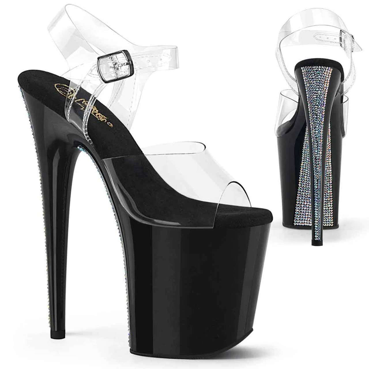 Exotic Dancer Ankle Strap Sandal w/ Contrast Rhinestones on the Platform Underside & Back of Heel. Approximately 8″ (200mm) Heel, 4″ (100mm) Platform
