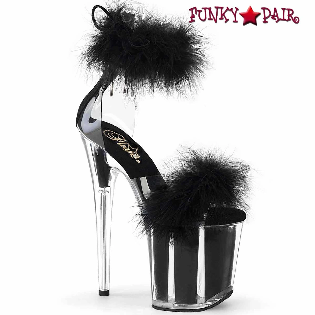 Approximately 8″ (200mm) Heel, 4″ (100mm) Platform Close Back Ankle Cuff Sandal w/ Side Lacing Featuring Marabou Fur on Vamp and in the Platform Bottom, Back Zip Closure