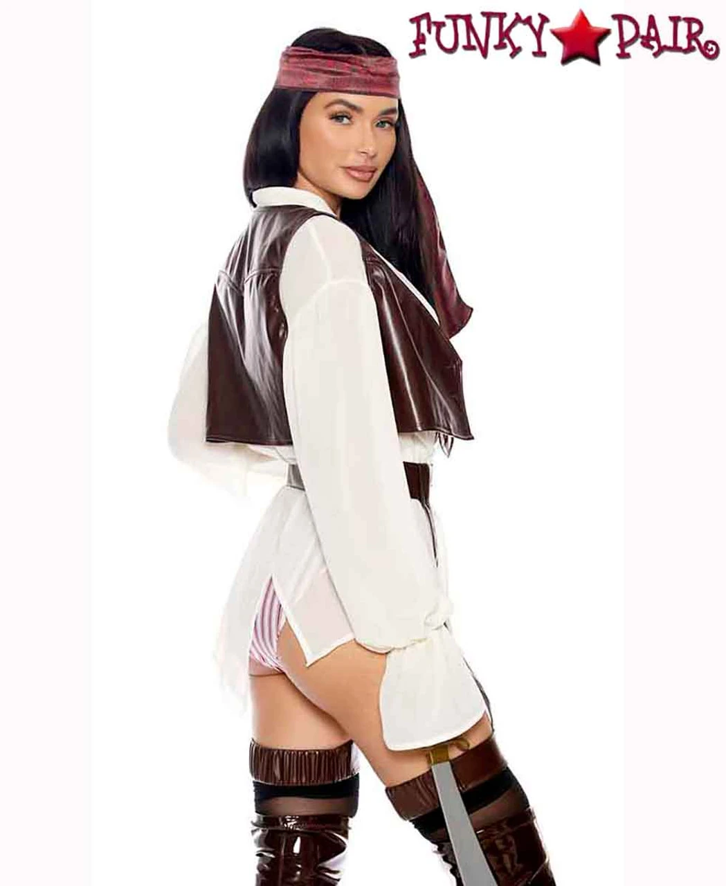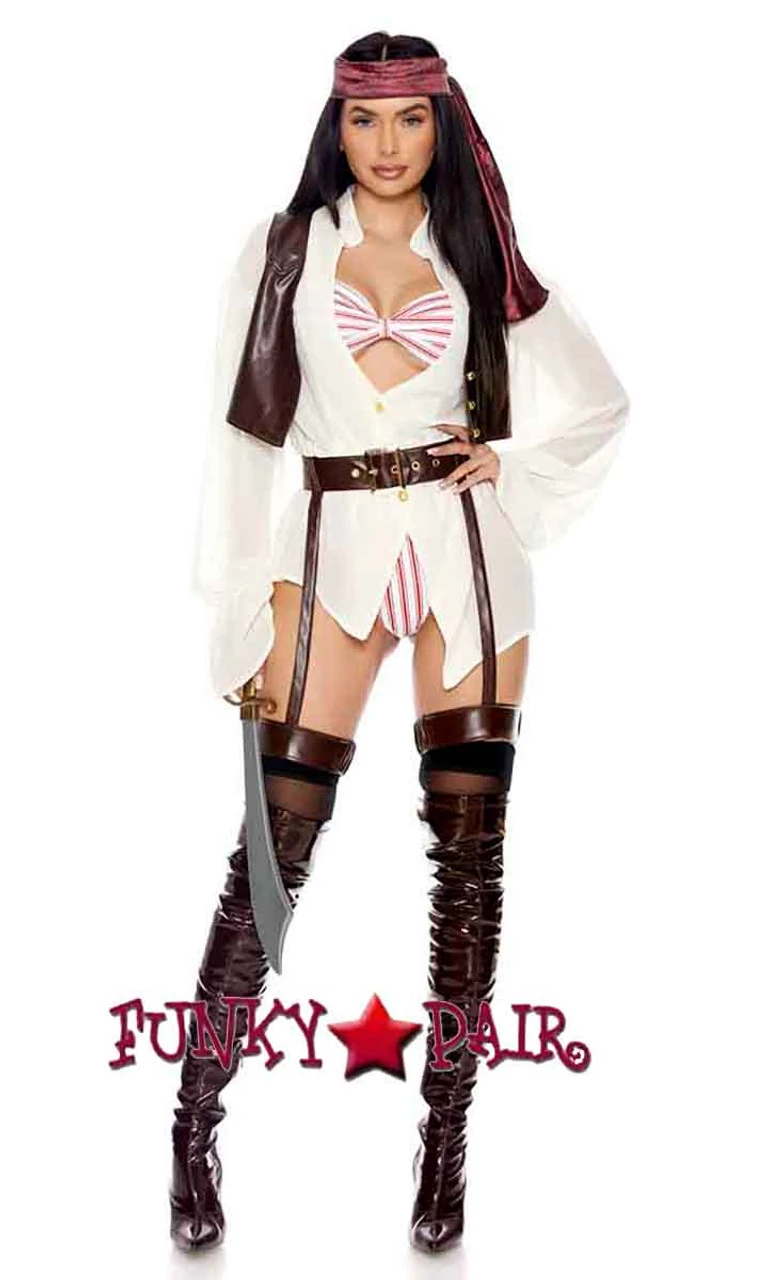 6-piece sexy movie character costume features striped bandeau top and matching bottom paired with sheer mesh asymmetrical over shirt and faux leather cropped vest and matching faux leather garter belt with satin head scarf.