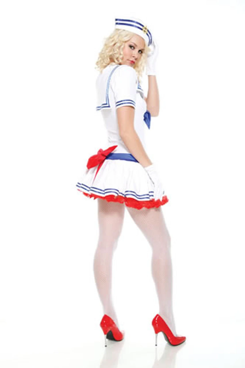 Set sail for seduction in style! Sailor Sweetie lets you show off all your seaworthy stuff in this pleated skirt mini dress. Detailed in ocean blue trim along the hem, cuffs, and wide collar, and finished off with a decorative red bow on backside. With matching hat and gloves this costume is ready to show off!