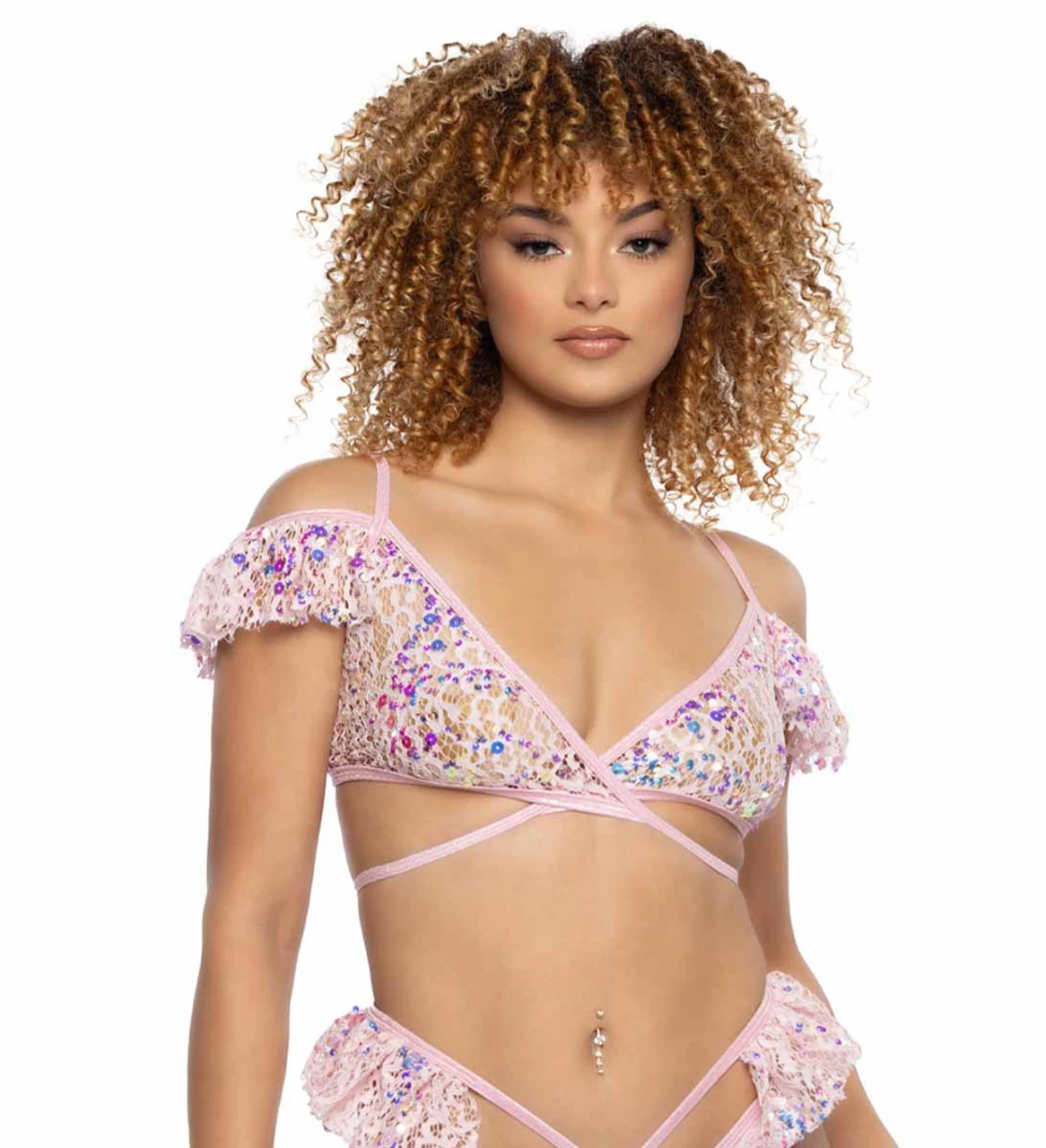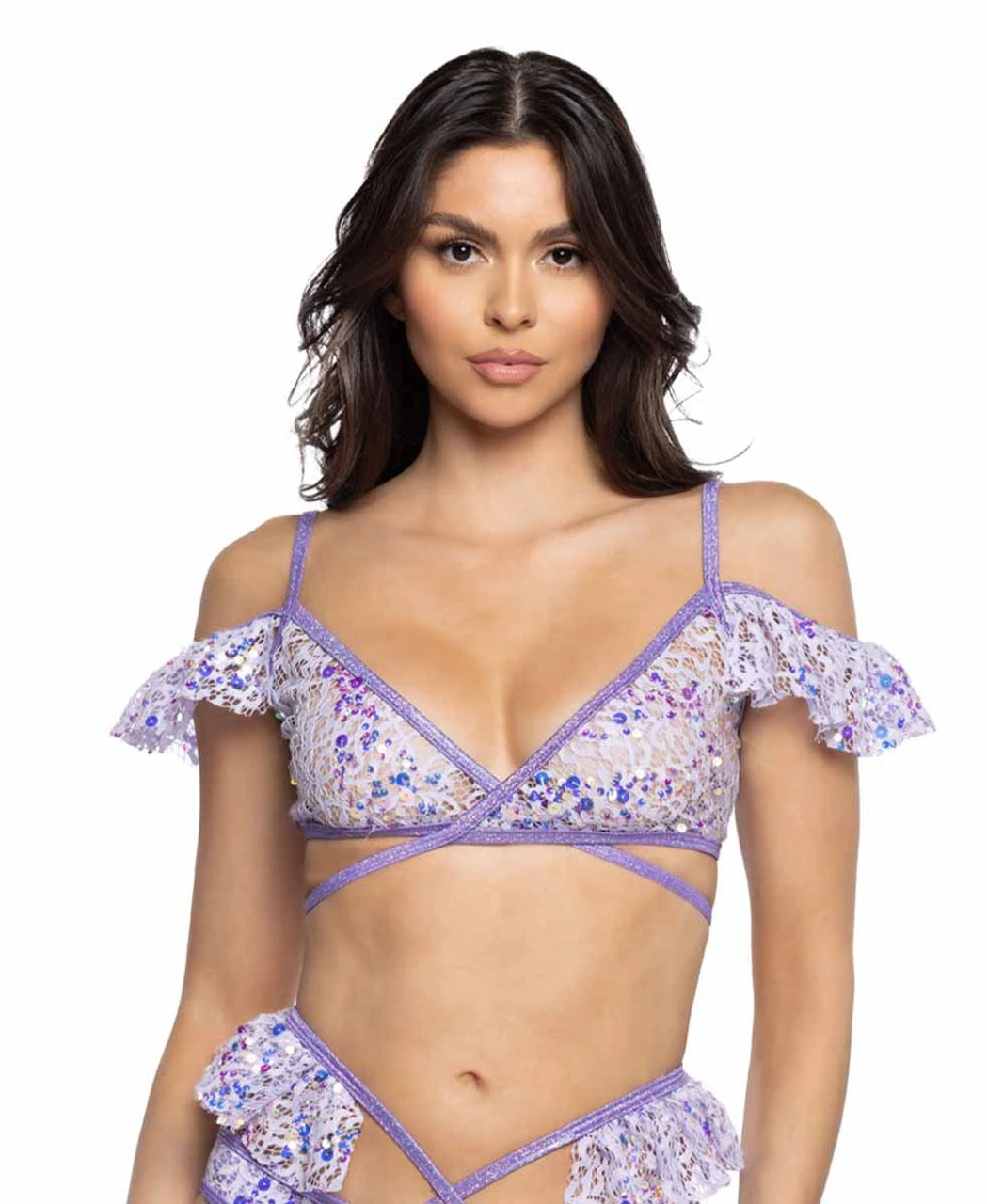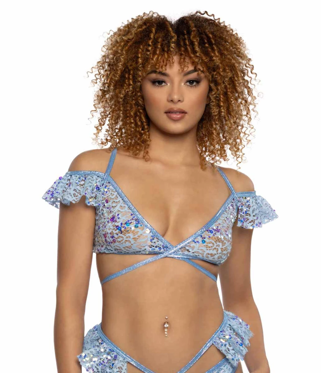 Sequin & Lace Off-the-Shoulder Wrap Top, Fabric: 90% POLYESTER 10% SPANDEX, Made in USA, Wash: Hand Wash Cold