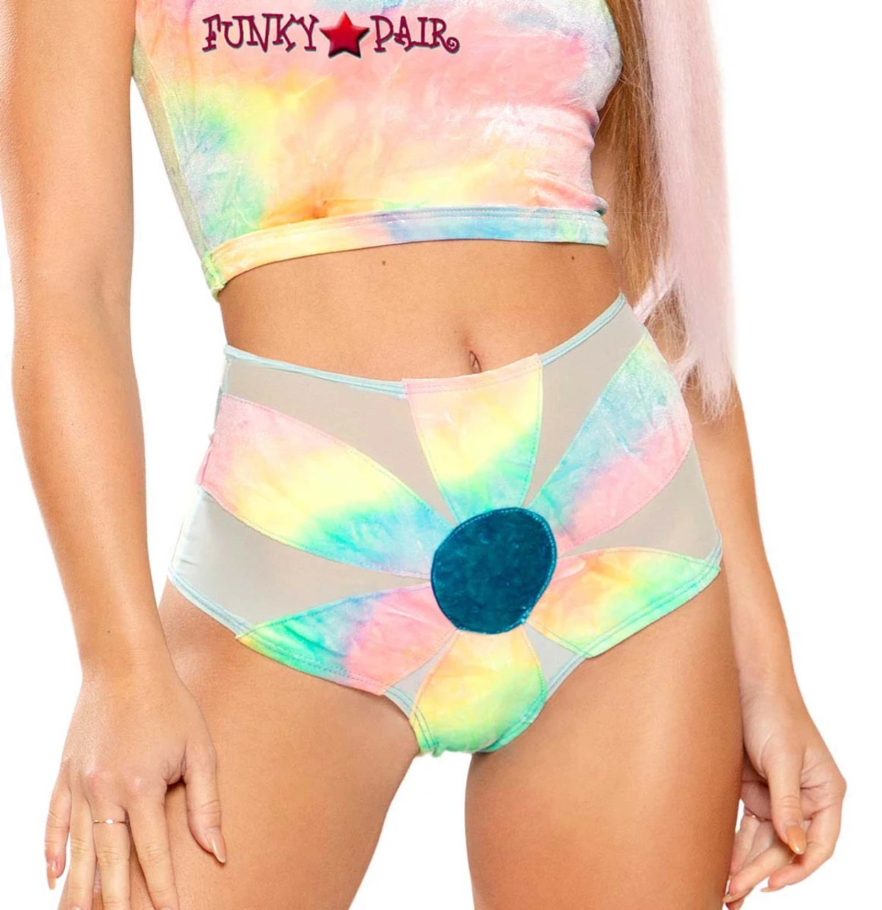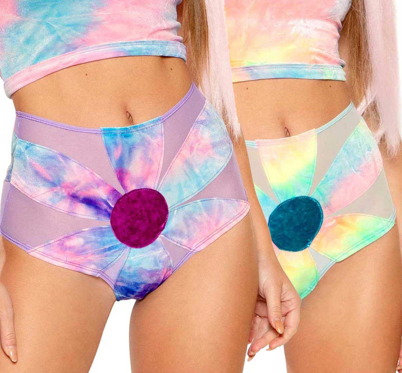 J. Valentine JV-FF156, Tie-Dye Daisy Short. High-Waist, Zipper-Back, Stretch Mesh/Velvet. Fabric: 90% Polyester 10% Spandex