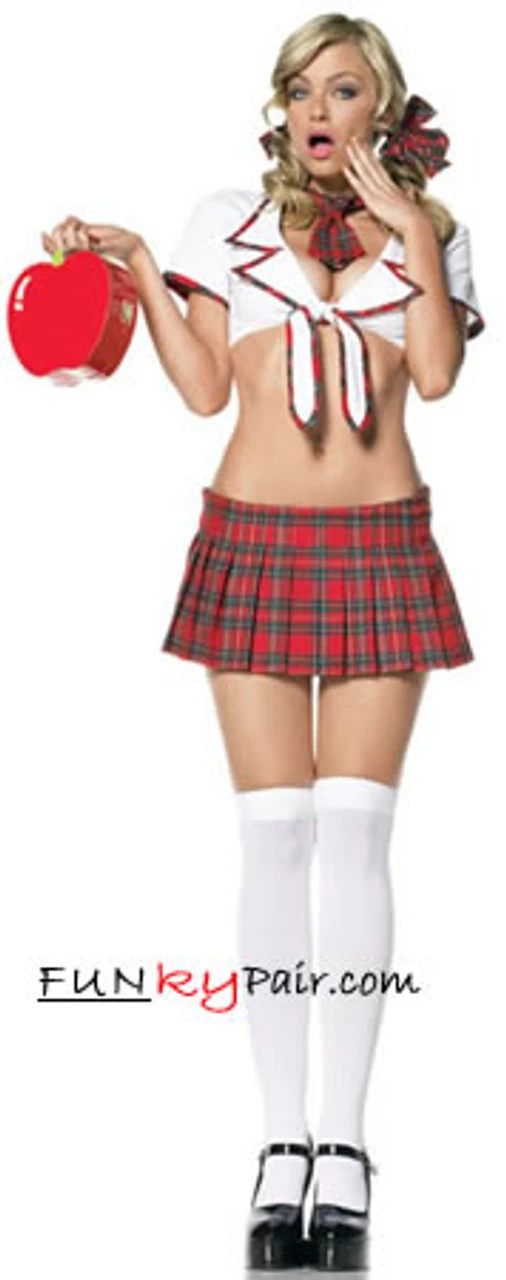 4pc Miss Prep School Girl Costume, includes hair bows, tie, cropped tie top and skirt.