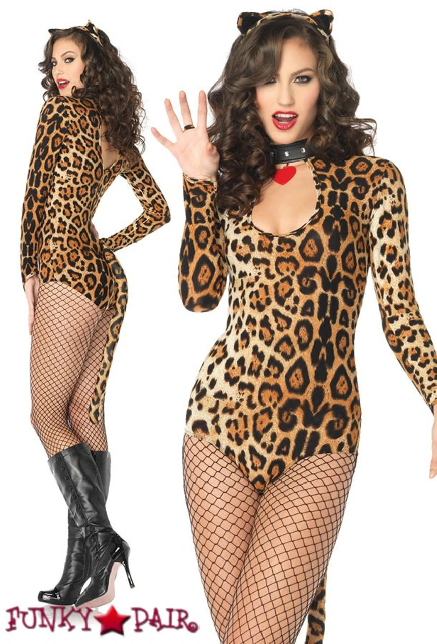2pc Wicked Wildcat, includes keyhole teddy with tail and gauntlet sleeve, attached collar with heart tag and matching ear headband.