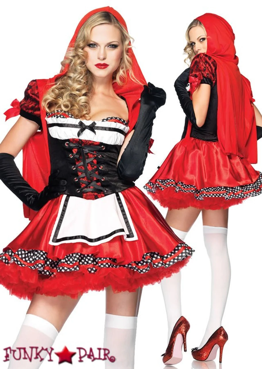 Divine Miss Red Costume, features ribbon trimmed layered apron dress with padded bra bodice detail, lace accents, and attached hood. Petticoat and hosiery sold separately