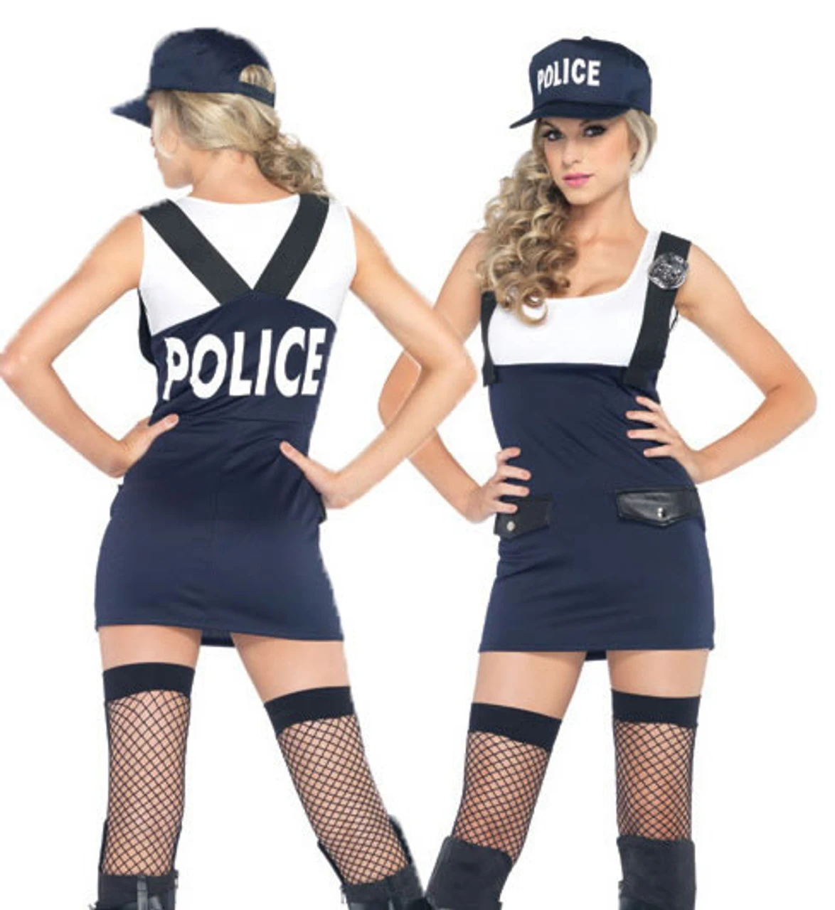 2pc costume includes suspender dress with screen print back detail, attached badge accent and matching hat