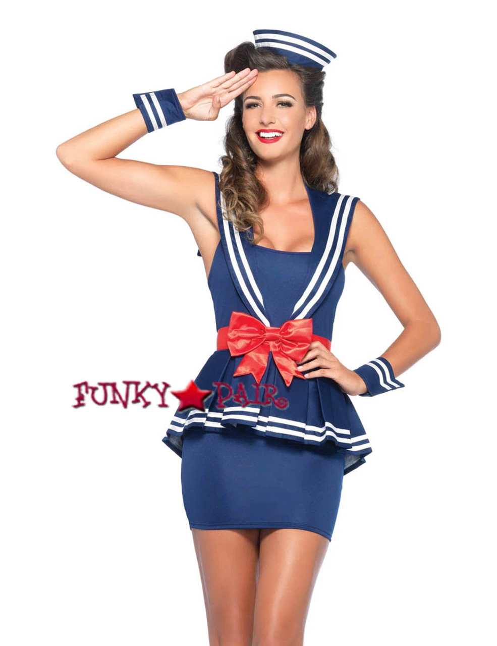 4pc. Sailor Captain costume includes, peplum sailor dress, bow, belt, wrist cuffs, and matching hat.