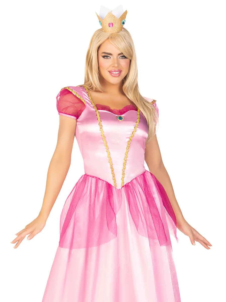 2 PC. Pink Princess costume includes, long satin gown with iridescent glitter tulle pannier accents and matching crown headband. (Gloves sold separately)