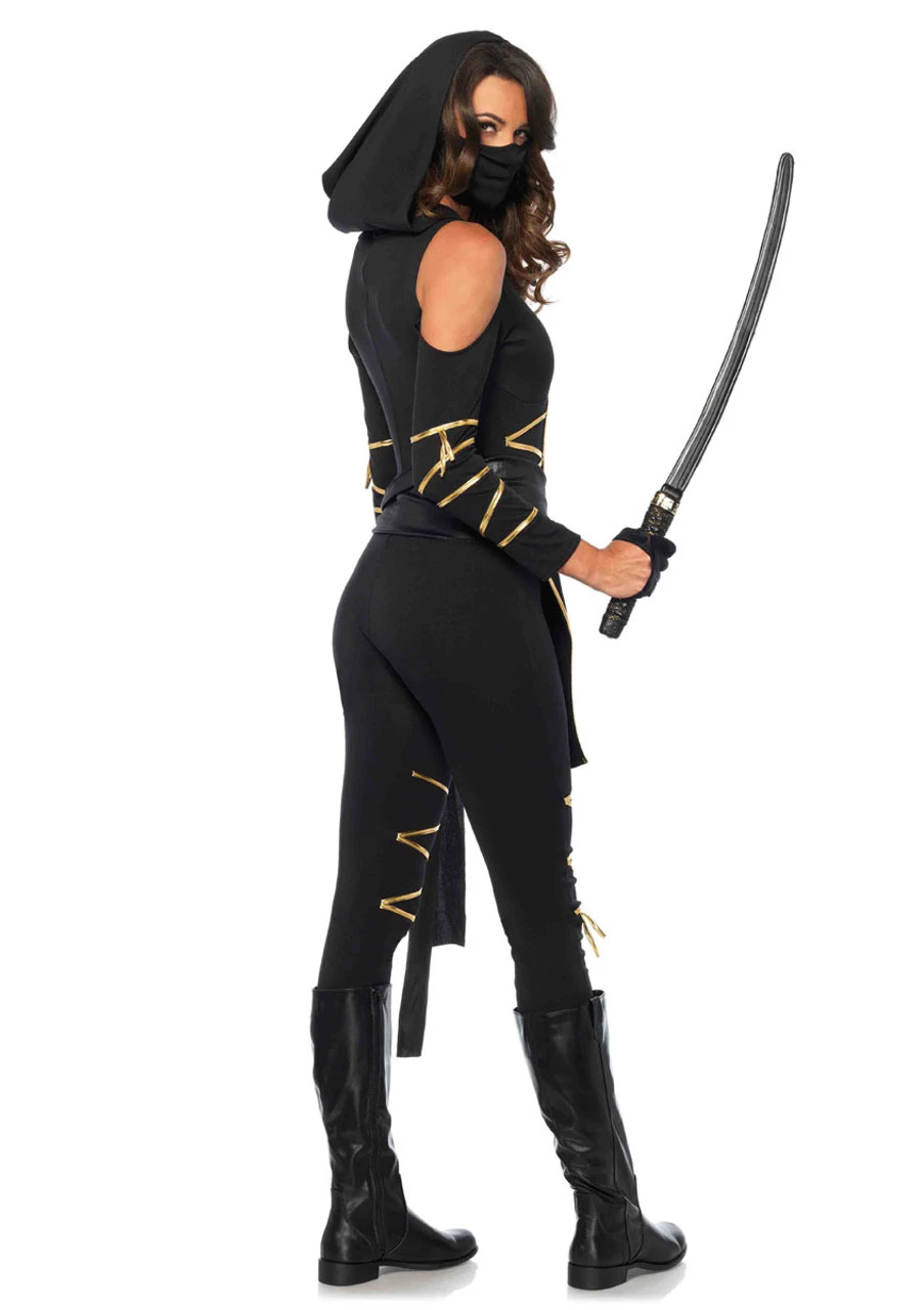 3 PC. Stealth Ninja Costume, includes hooded cold shoulder catsuit with dragon accents and wrap around ties, waist sash, and face mask. (Gloves sold separately)