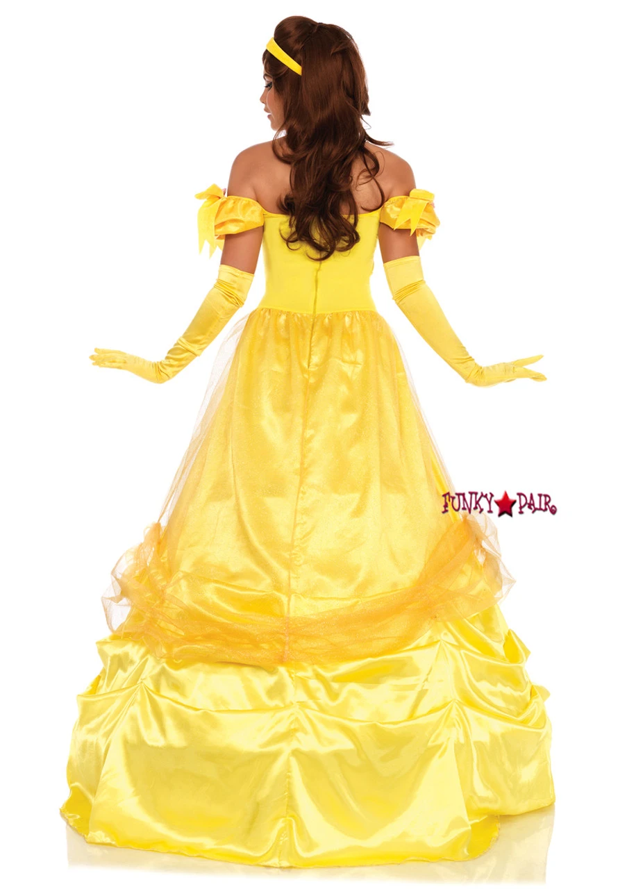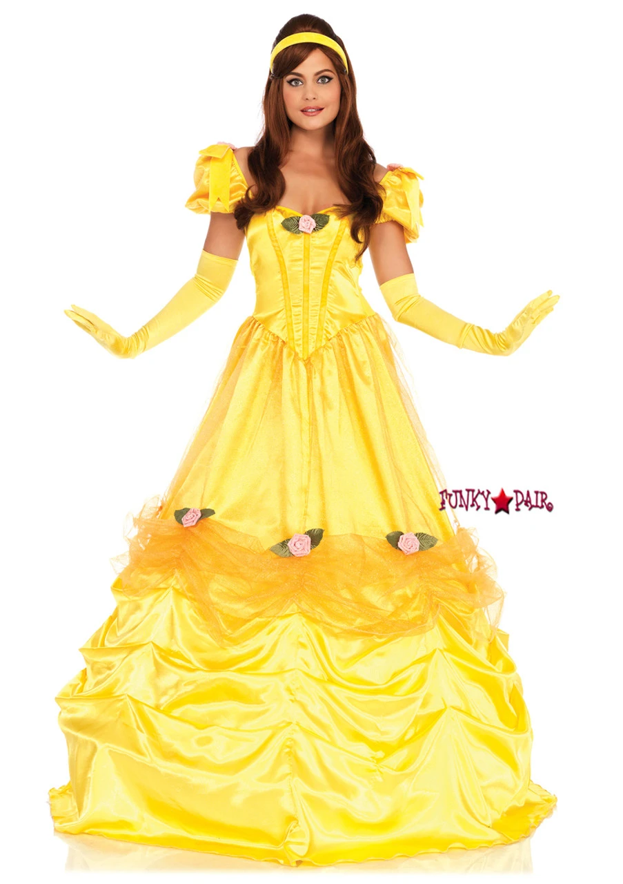 3PC. Bell of the Ball costume includes, long satin ball gown with ruched rosette trimmed skirt and velvet bow accents, head piece and clear straps. (Gloves sold separately)