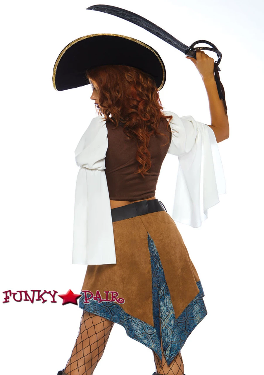 3 PC Swashbuckling Siren, includes faux suede crop top with split peasant sleeves, high waist shorts, and belt with attached skirt and fringe sash