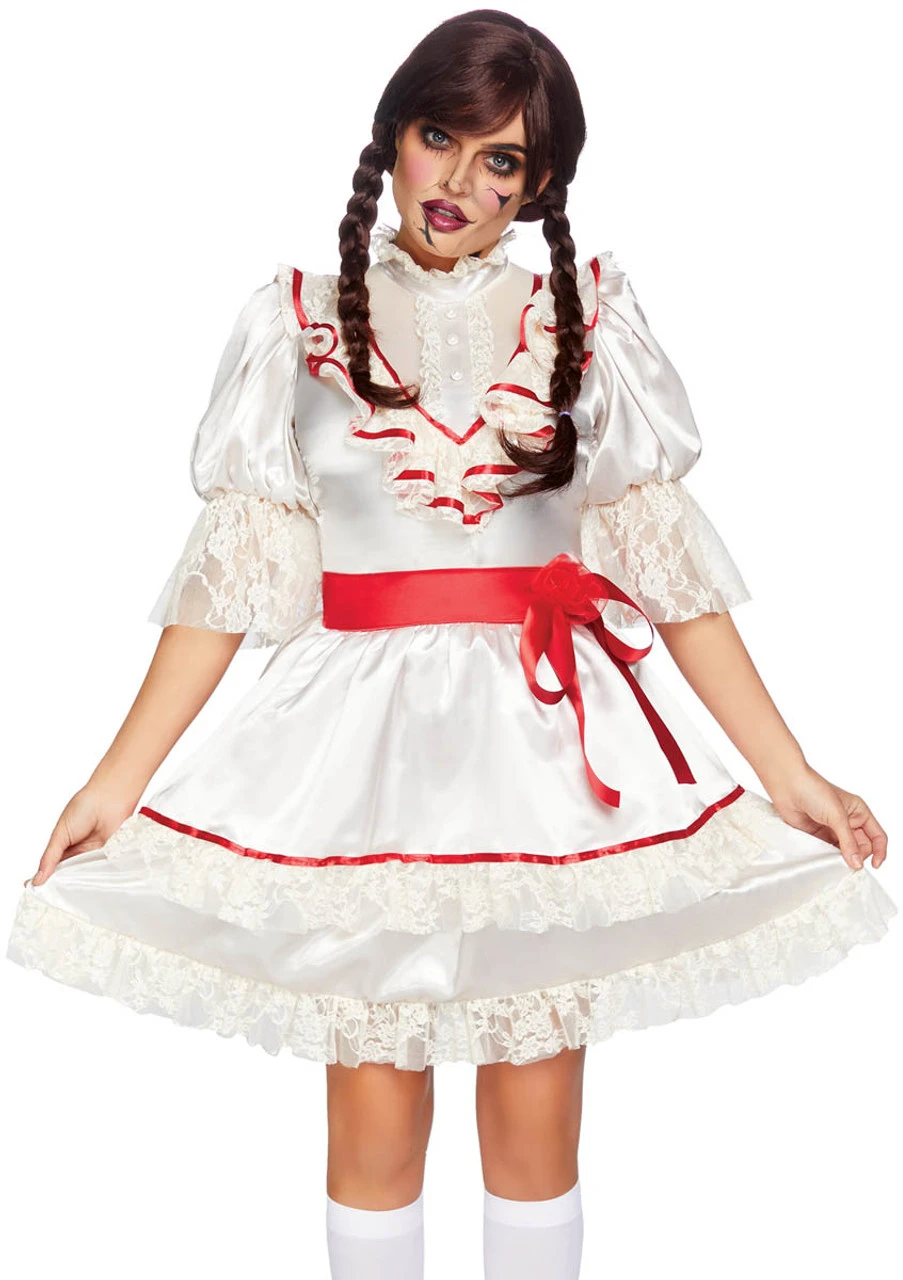 Haunted Doll, features satin lace trimmed antique doll dress with attached bow sash.