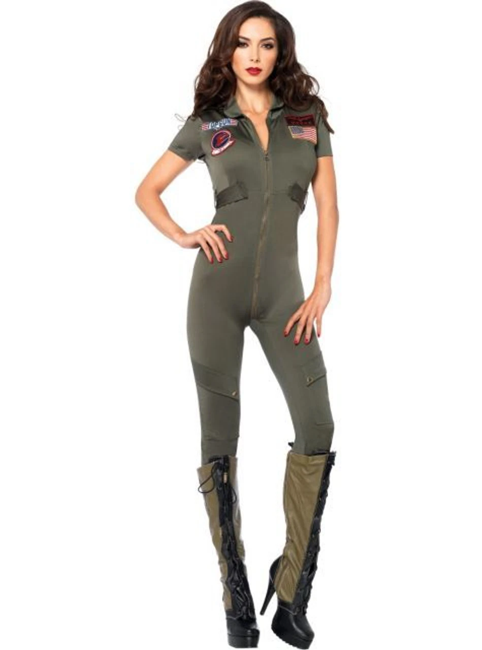 Top Gun Flight Suit costume features zipper front spandex catsuit with interchangeable Maverick and Goose name badges