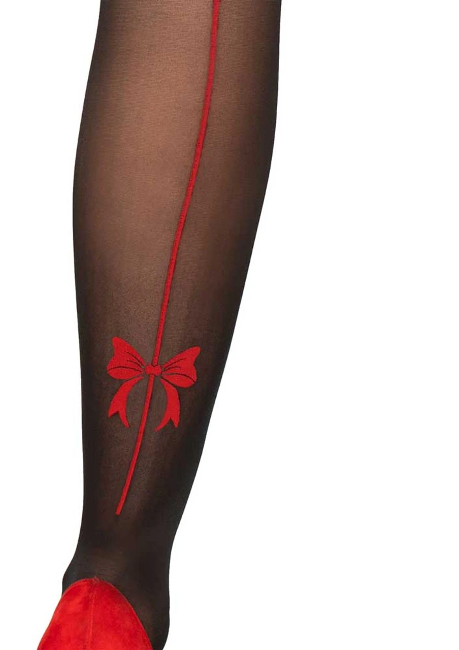 Spandex sheer pantyhose with contrast backseam and bow accent.
