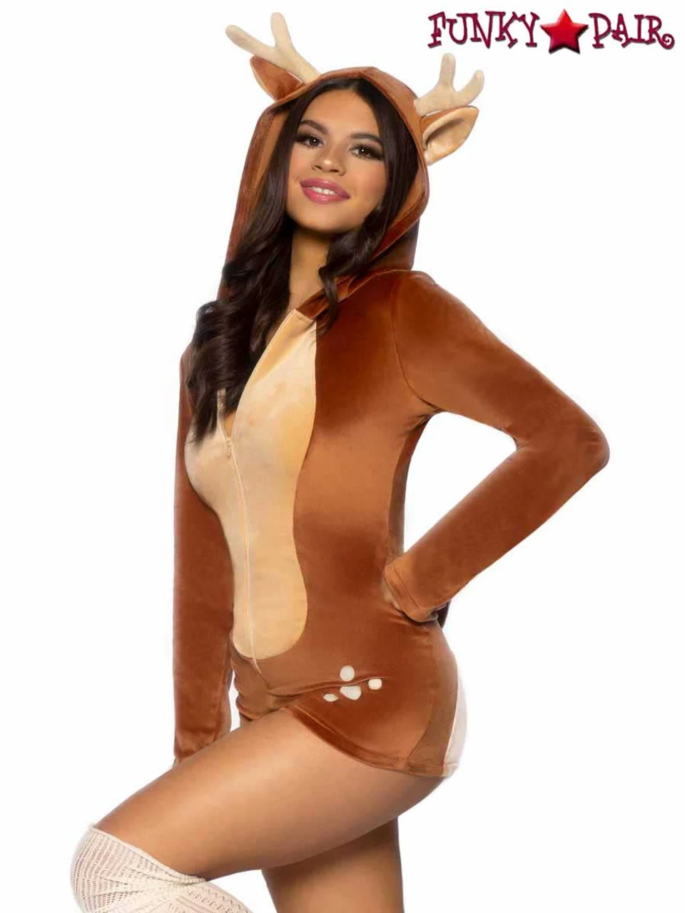 Comfy Fawn, features ultra-soft velvet plush zip up romper with spotted detail, antler and ear hood, and cheeky paneled booty with fawn tail.