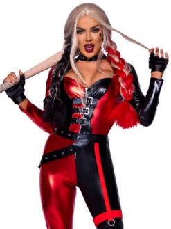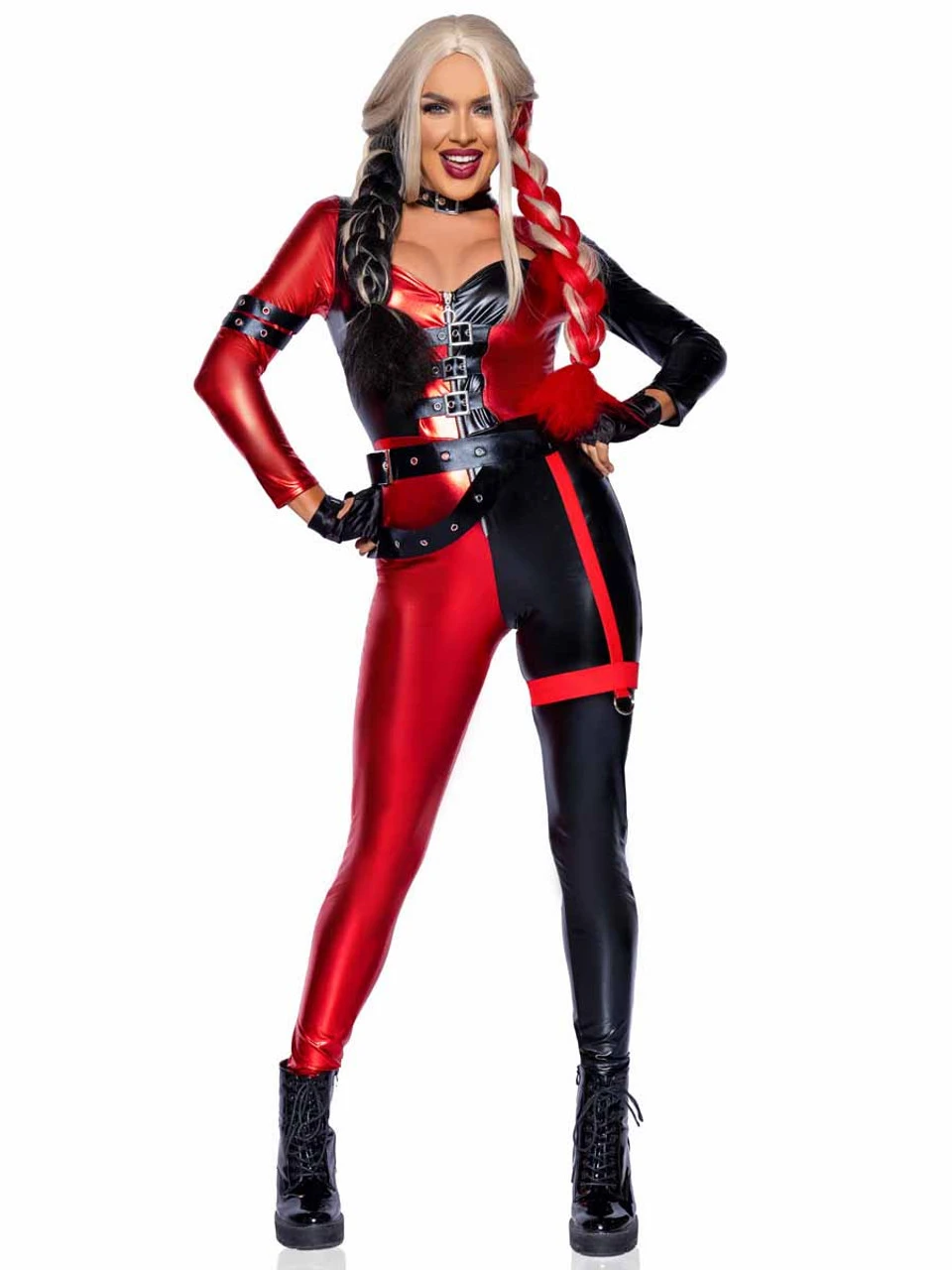2 PC Chaos Cutie, includes two-tone zip up catsuit with buckle detail and belt with attached garter.