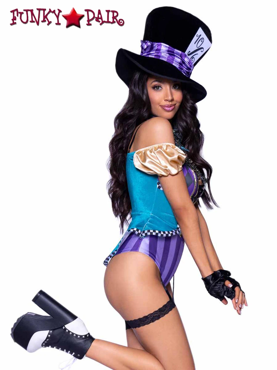 3 PC Mischievous Mad Hatter, includes garter bodysuit with strappy deep-V and puff sleeves, bow collar, and mad hatter hat.