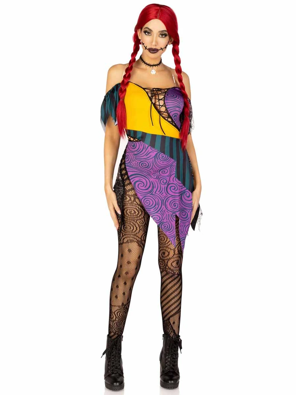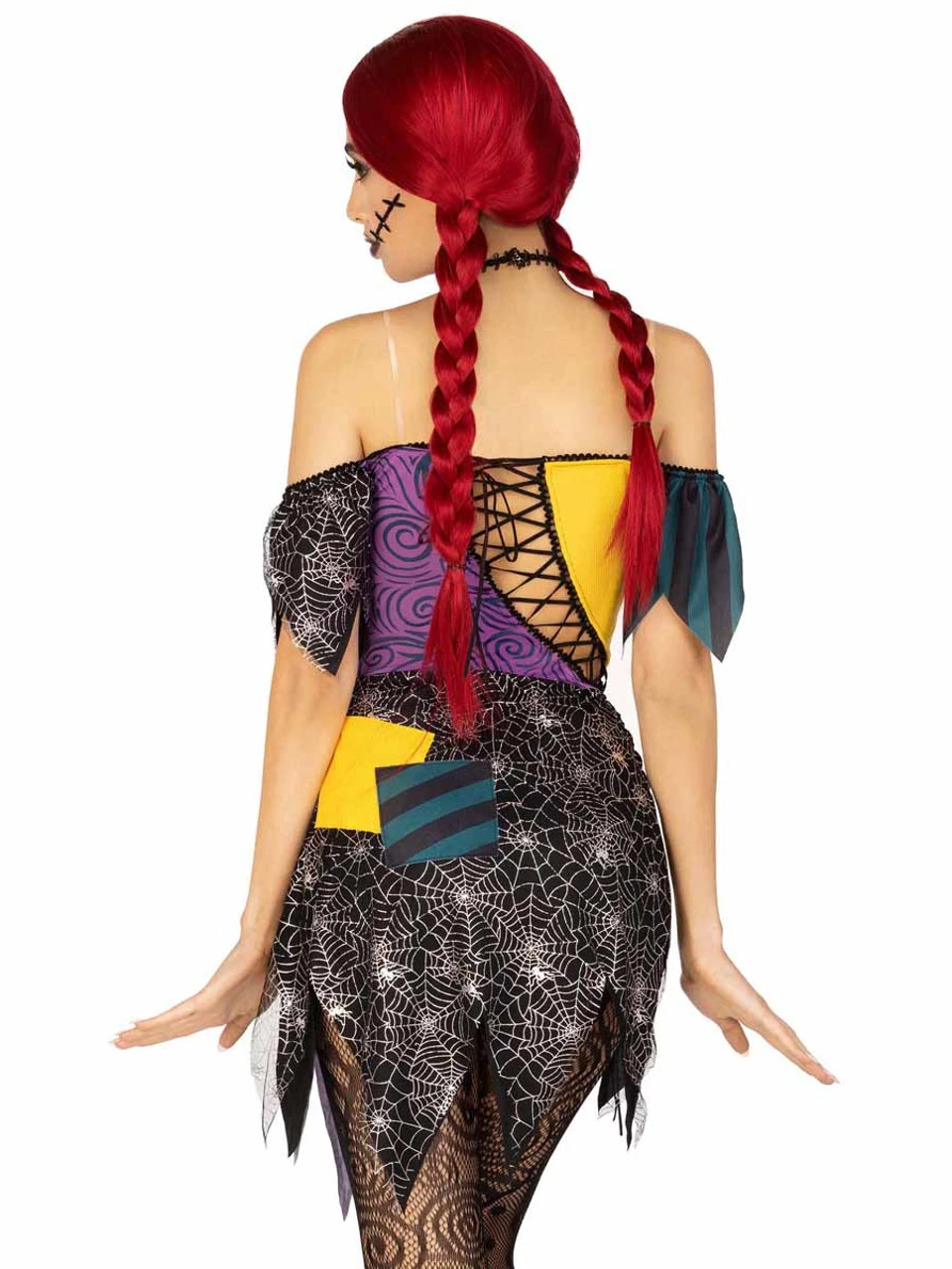 3 PC Darling Rag Doll, includes patchwork dress with adjustable lace ups and tattered skirt, detachable clear straps, and skull head choker.