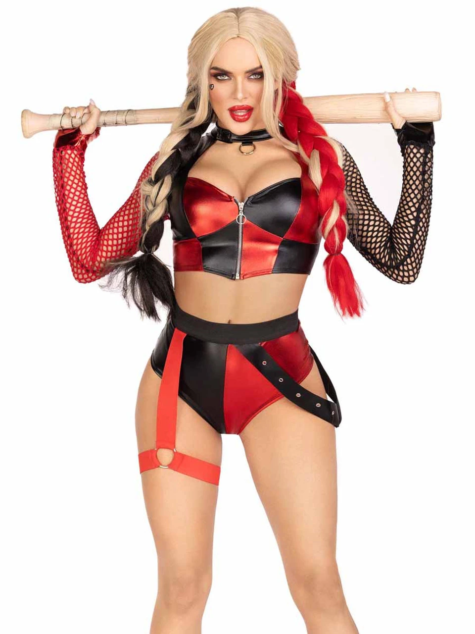 2 PC Crime Spree Sweetie, includes zip up crop top with gloved net sleeves and bottoms with attached garter.