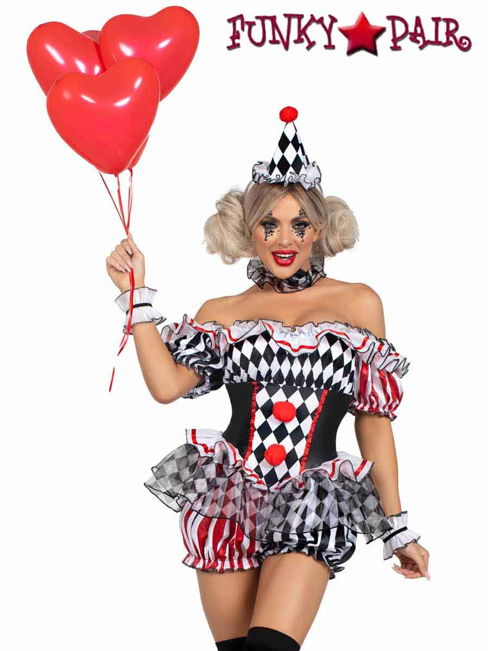 4 PC Darling Harlequin, includes ruffle trimmed bloomer romper with pom pom accents, wrist ruffles, neck ruffle, and hat headband