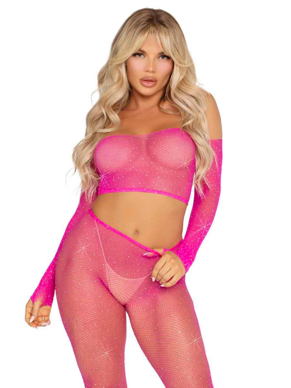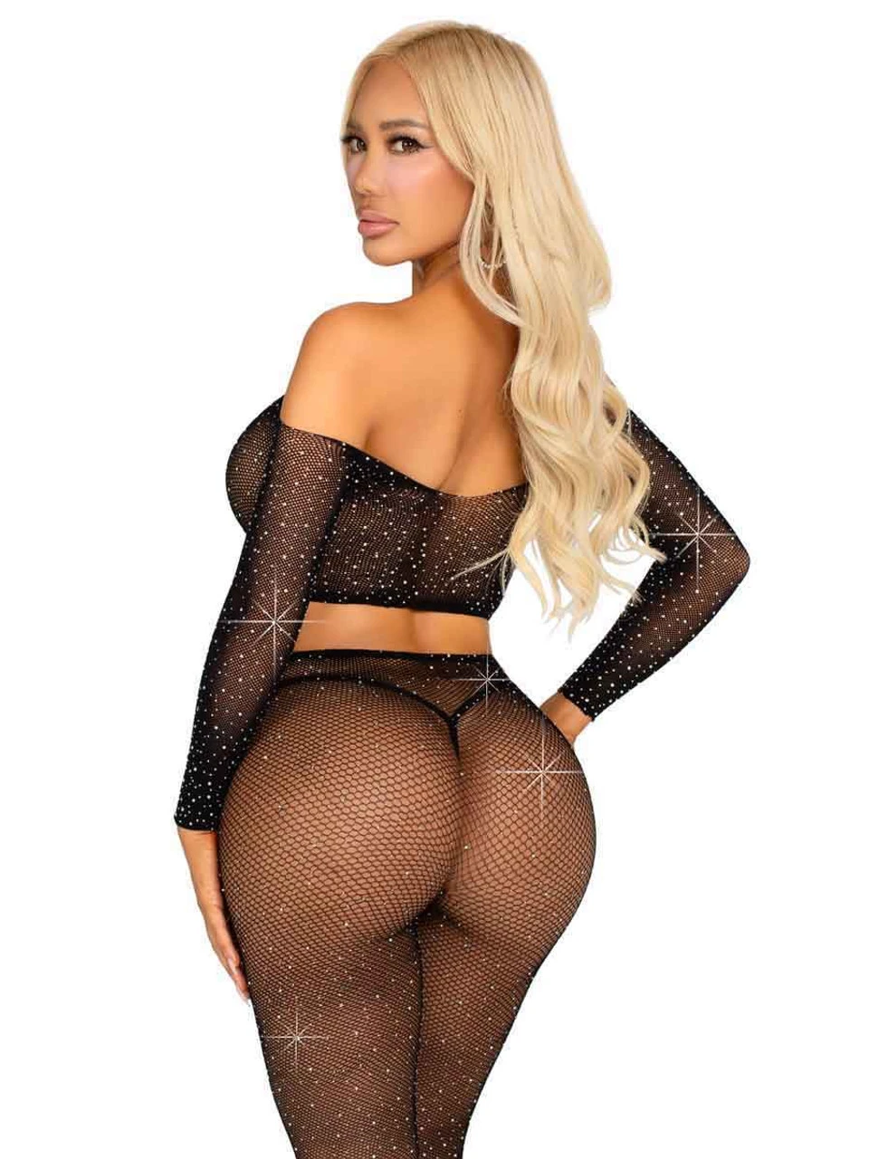Rhinestone fishnet crop top and footless tights.