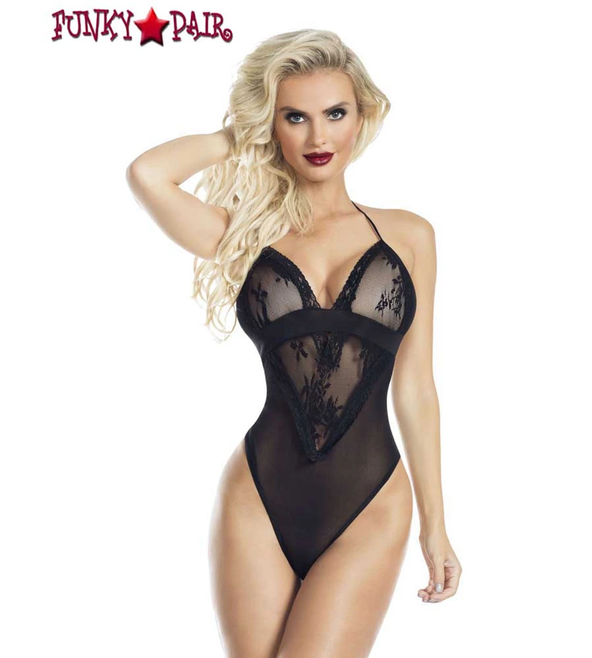 Rave Wear Lingerie Halter black teddy with mesh and lace detail. AB6071