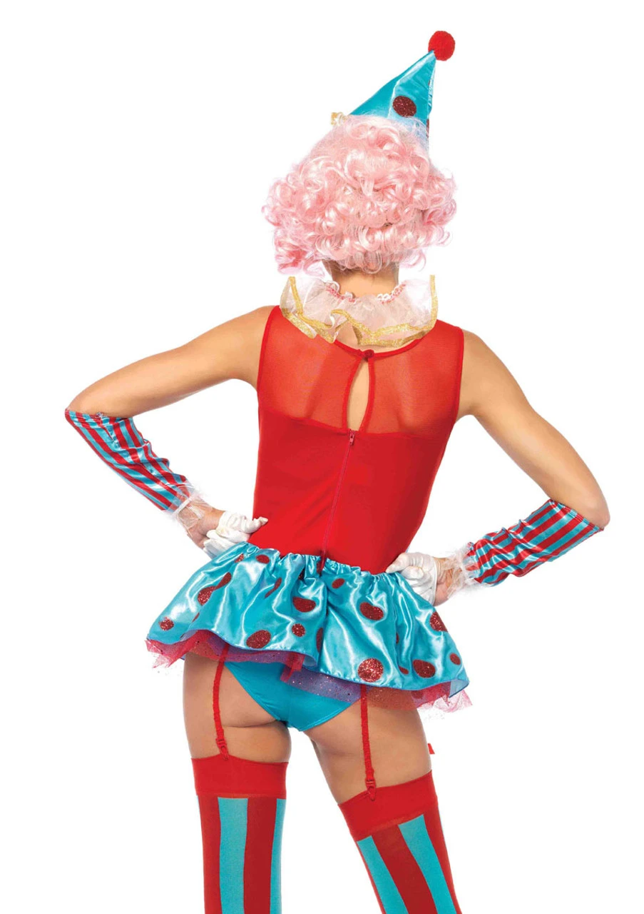 4 PC. Delightful Circus Clown Costume includes satin garter teddy with glitter polka dot peplum skirt and lace applique accent, ruffle neck piece, arm cuffs, and matching clown hat. (Gloves and Hosiery not included)