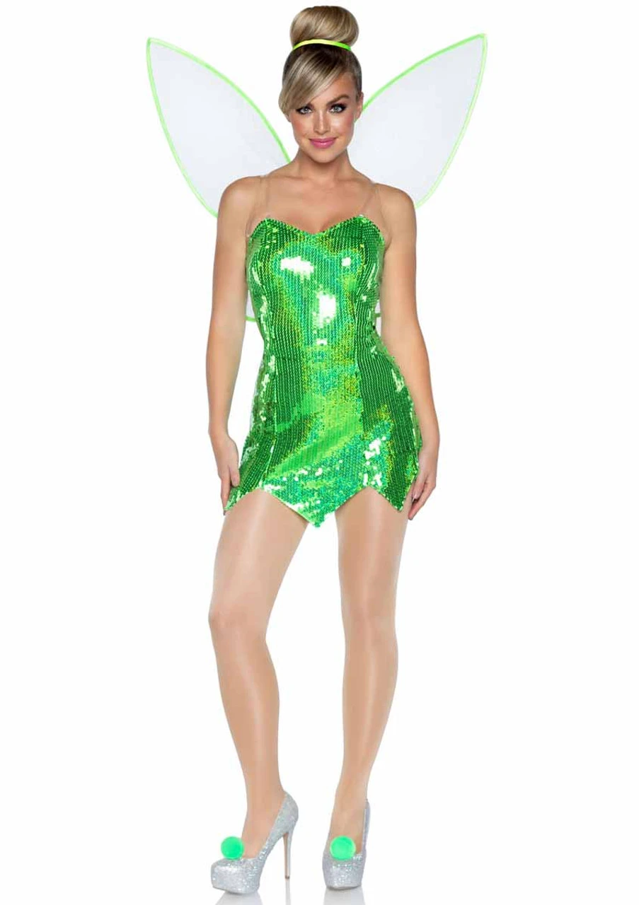 Green Fairy costume includes sequin dress, removable clear straps, shorts ,fairy wings, hair ribbon, and shoe pom poms