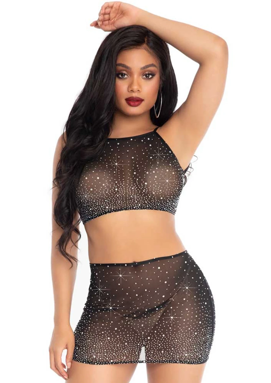 Head to the club in this sheer swank of an outfit! Our rhinestone-encrusted crop top and mini skirt will make sure you sparkle in all the right places.