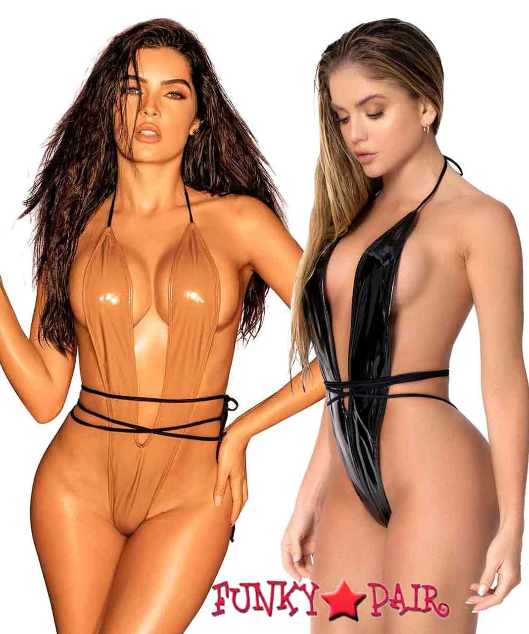 1PC Vinyl bodysuit with deep neckline, extra-high leg cut, contrasting wrap-around waist, and thong bottom.