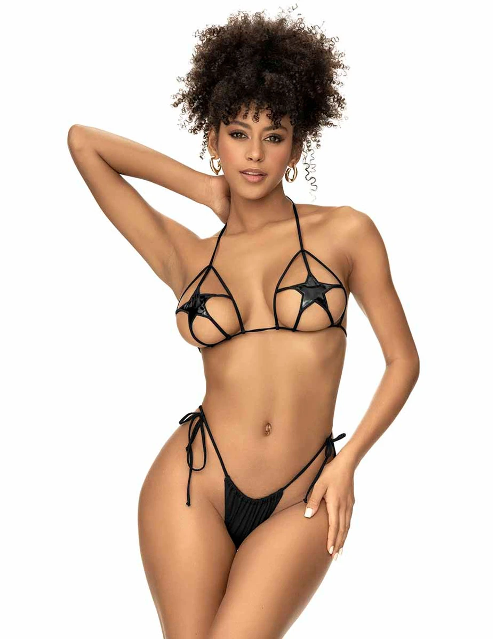 2PC Bikini set with laser cut-out star triangle top with a gloss black finish and side tie thong.