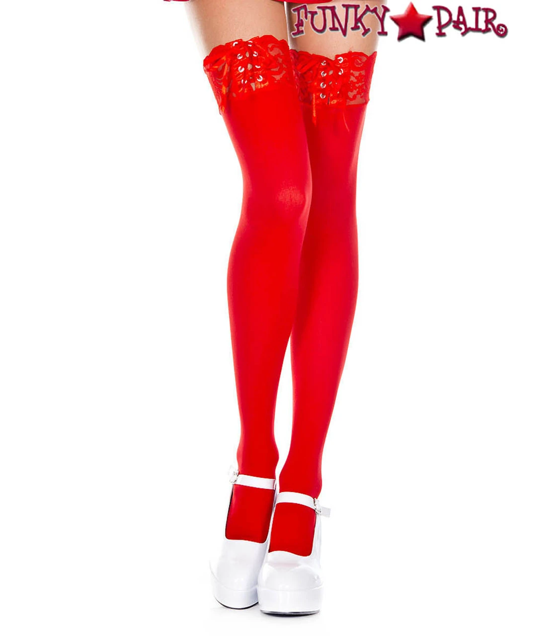 Our Opaque Thigh High stockings feature adjustable lace for a perfect fit and support. With ample stretch and opacity, they’re designed to help you feel confident and stylish throughout the day. by Music Legs ML-4748