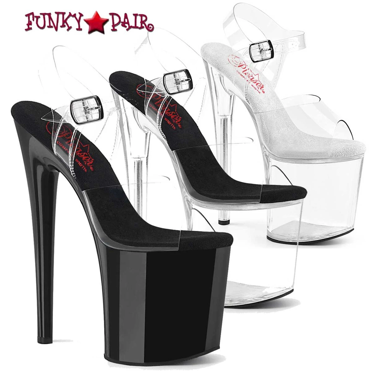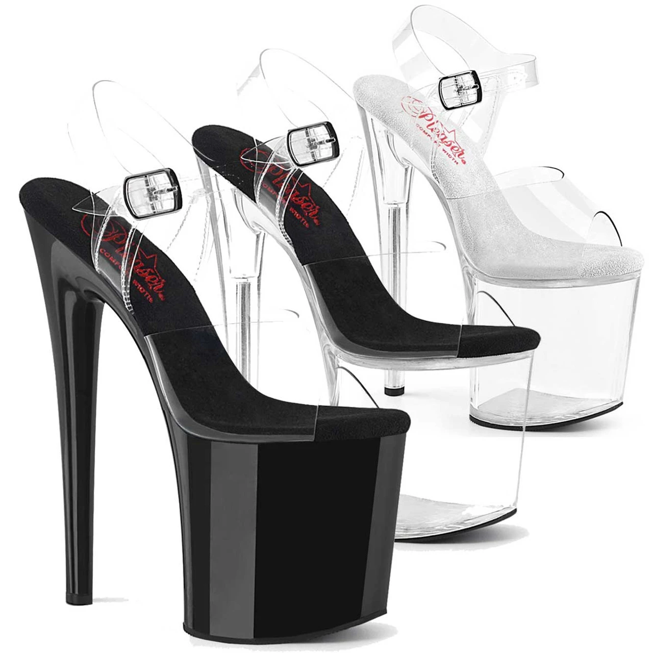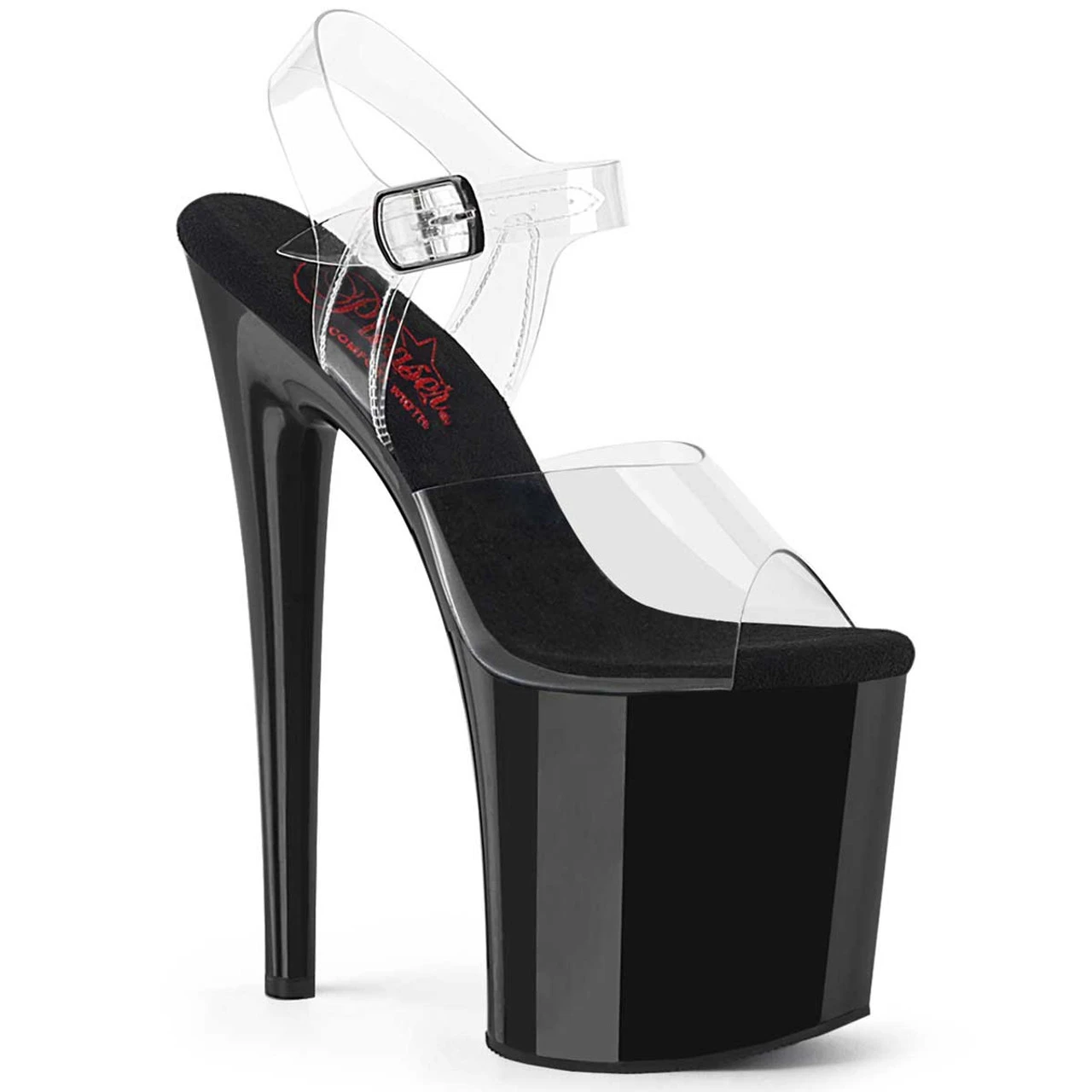 Clear Comfort Width Ankle Strap Sandal. Approximately 8″ (200mm) Heel, 4″ (100mm) Platform