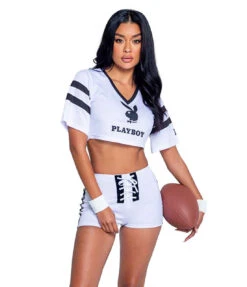 3PC Playboy Sporty Football Player Costume Includes: Cropped Jersey with Playboy Print Detail, High-Waisted Shorts with Playboy Print, and Cuffs. Football and Socks Not Included