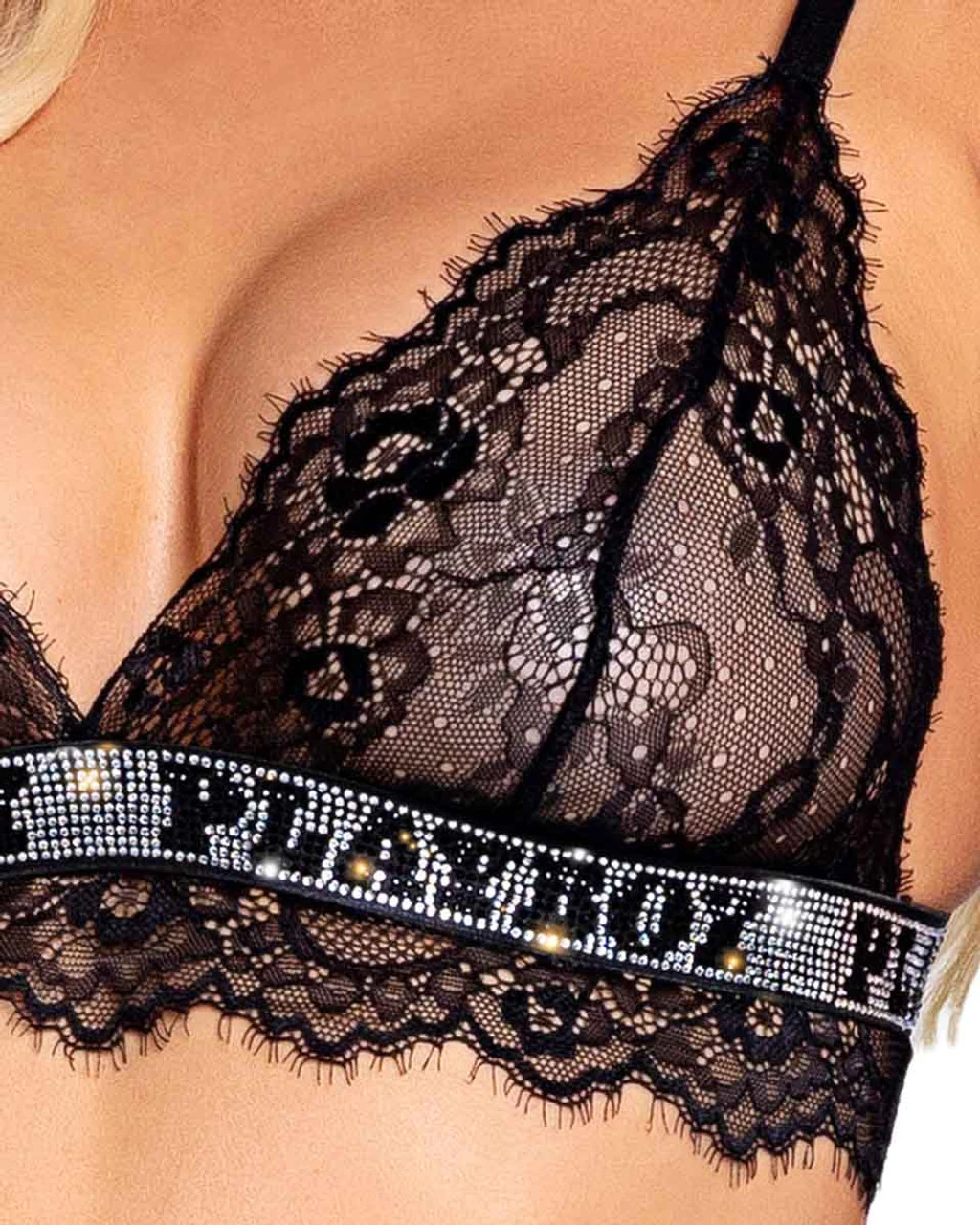 Bralette: Floral eyelash scallop lace, Playboy logo rhinestone elastic, Bikini cups, S-Hook closure, High Waisted Thong: Floral eyelash scallop lace, Playboy logo rhinestone elastic, Thong Back, Cotton Gusset