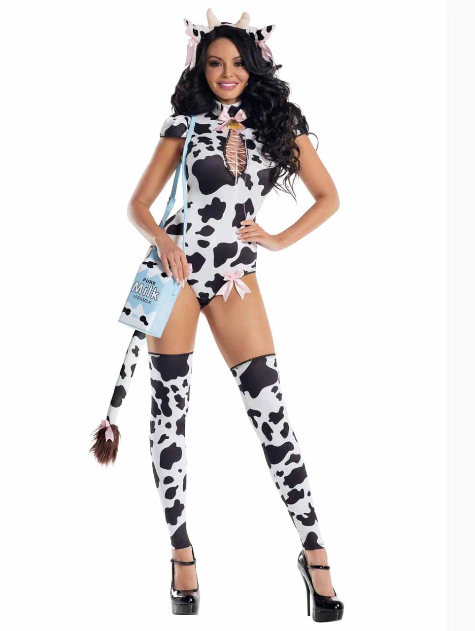 Bessie Cow printed teddy with front lace up and attached tail and satin bow details.? Comes with matching headpiece, milk purse and leg warmers.