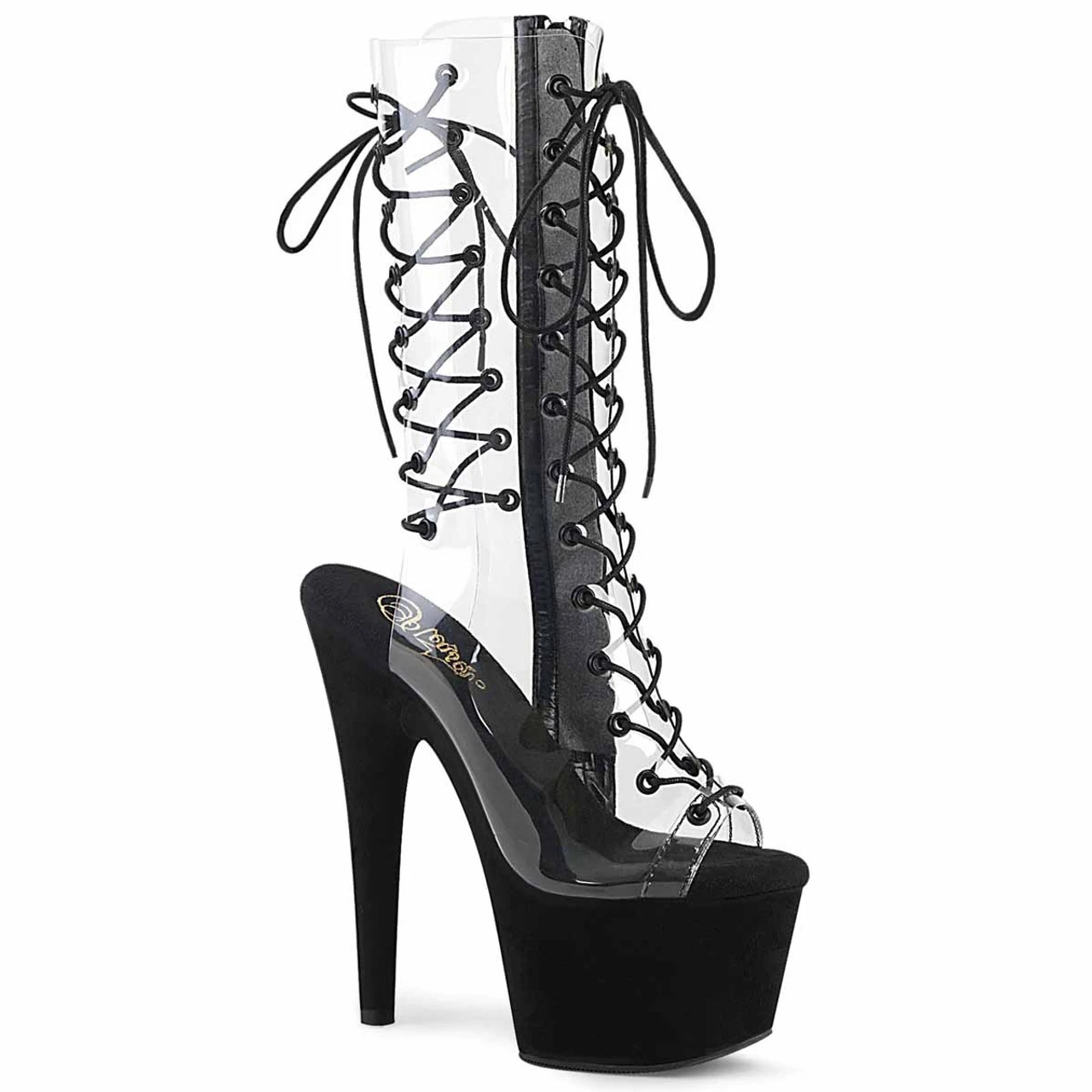 7″ Platform Lace-Up Front/Back Open Toe/Heel Mid Calf Boot Featuring Fully Wrapped Platform Bottom, Inside Zip Closure. Approximately 7″ (178mm) Heel, 2 3/4″ (70mm)