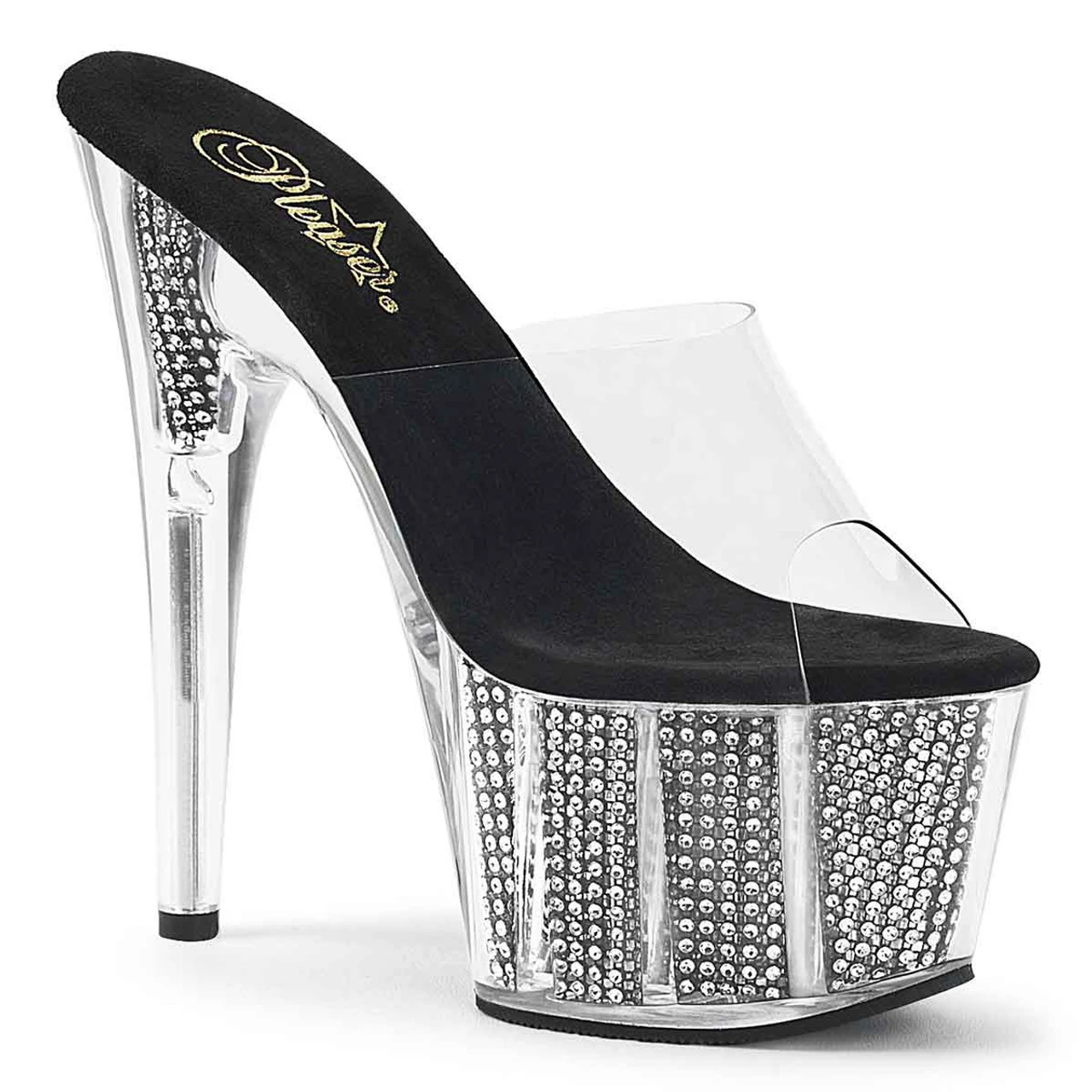 Pleaser Shoes Adore-701SRS Approximately 7 Inch (18cm) Heel, 2 3/4 Inch (7cm) Platform Slide Featuring Chrome Plated, Simulated Rhinestone Filled Platform Bottom.