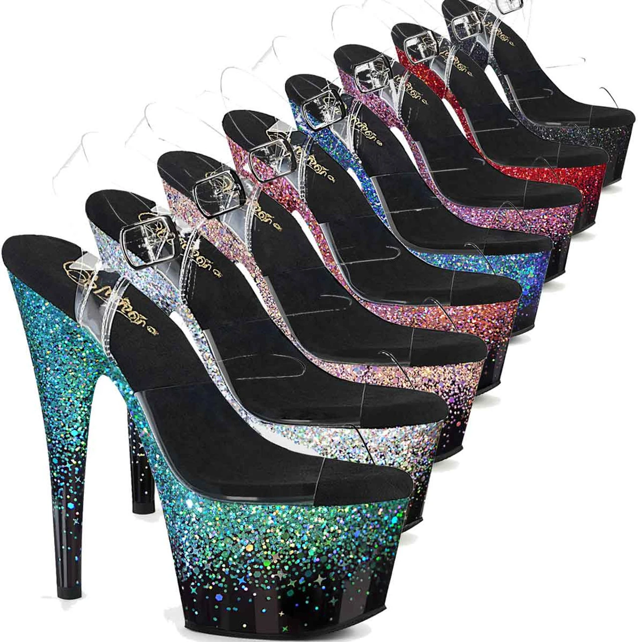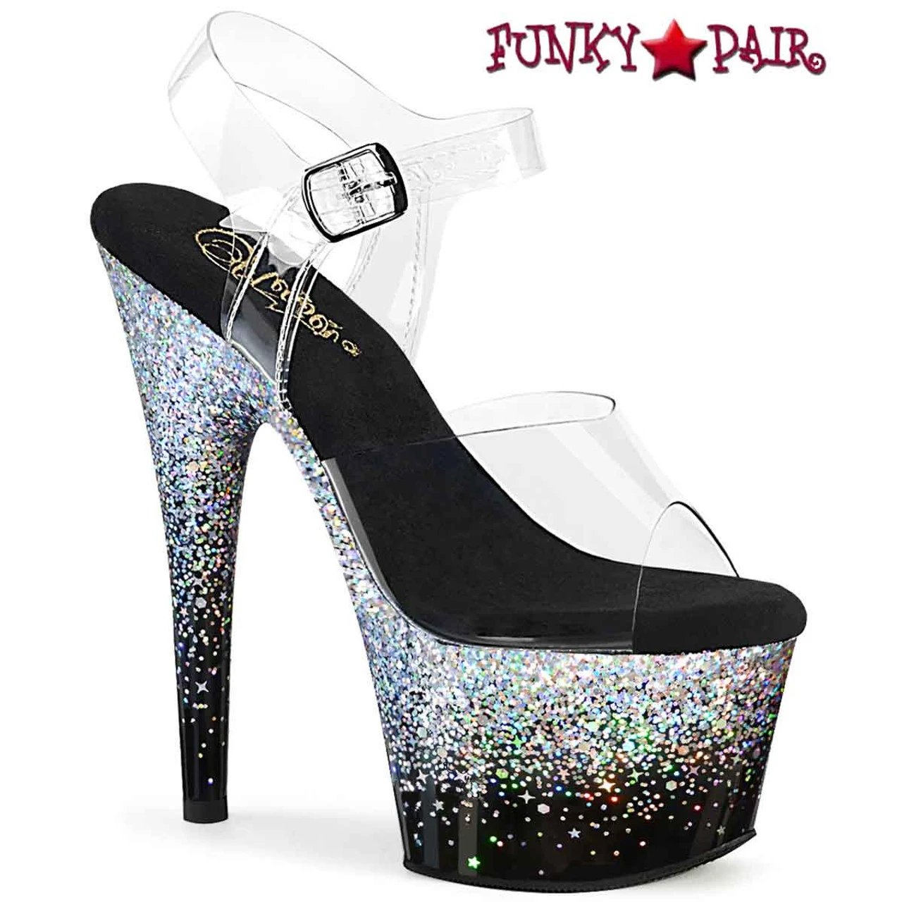 7″ (178mm) Heel, 2 3/4″ (70mm) Platform Ankle Strap Sandal w/Holographic Gradient Effect on the Platform Bottom