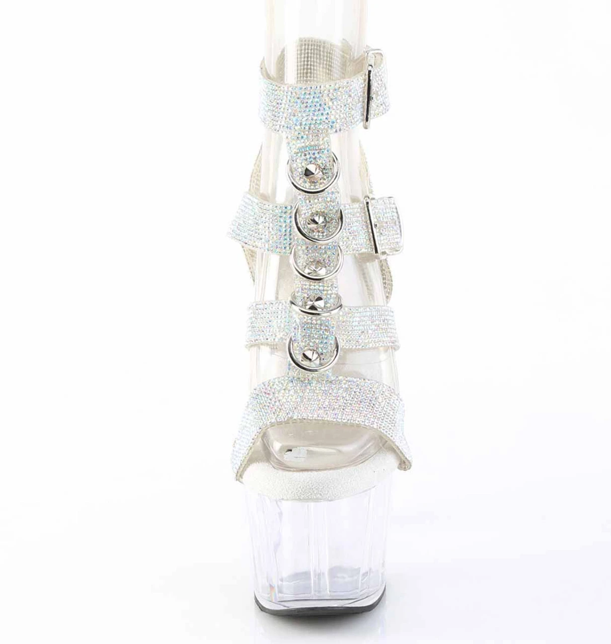 7″ (178mm) Heel, 2 3/4″ (70mm) Platform Rhinestone Embellished Strappy T-Strap Sandal Featuring Two Adjustable Buckle Straps, Cone Studs and Hardware Accents Going Up the Middle of the Shoe