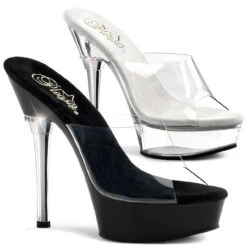Pleaser Shoes ALLURE-601 Pleaser collection Allure all come with approximately 5.5 inch chrome stiletto heel. Allure-601 is a mule that have a clear band with different color platforms to choose from. It chrome heel have a circle rhinestones at the top of the heel.