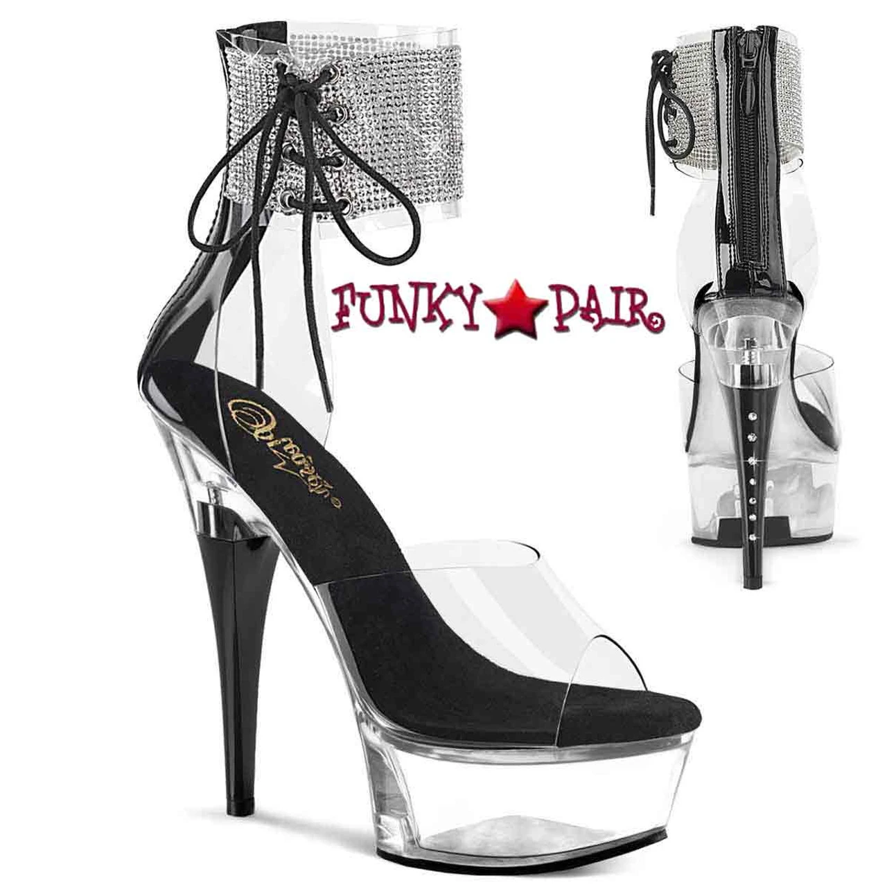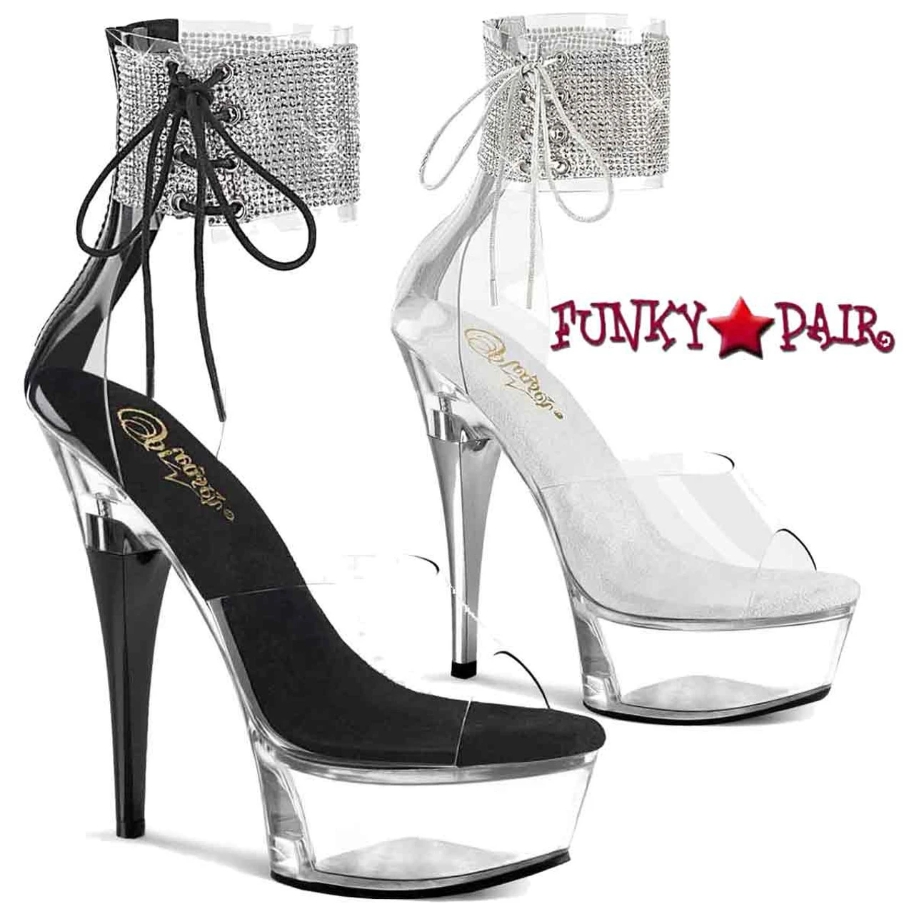 6″ (152mm) Heel, 1 3/4″ (44mm) Platform Close Back Rhinestone Embellished Ankle Cuff Sandal with Side Lacing Featuring Rhinestone on Back of Heel, Back Zip Closure