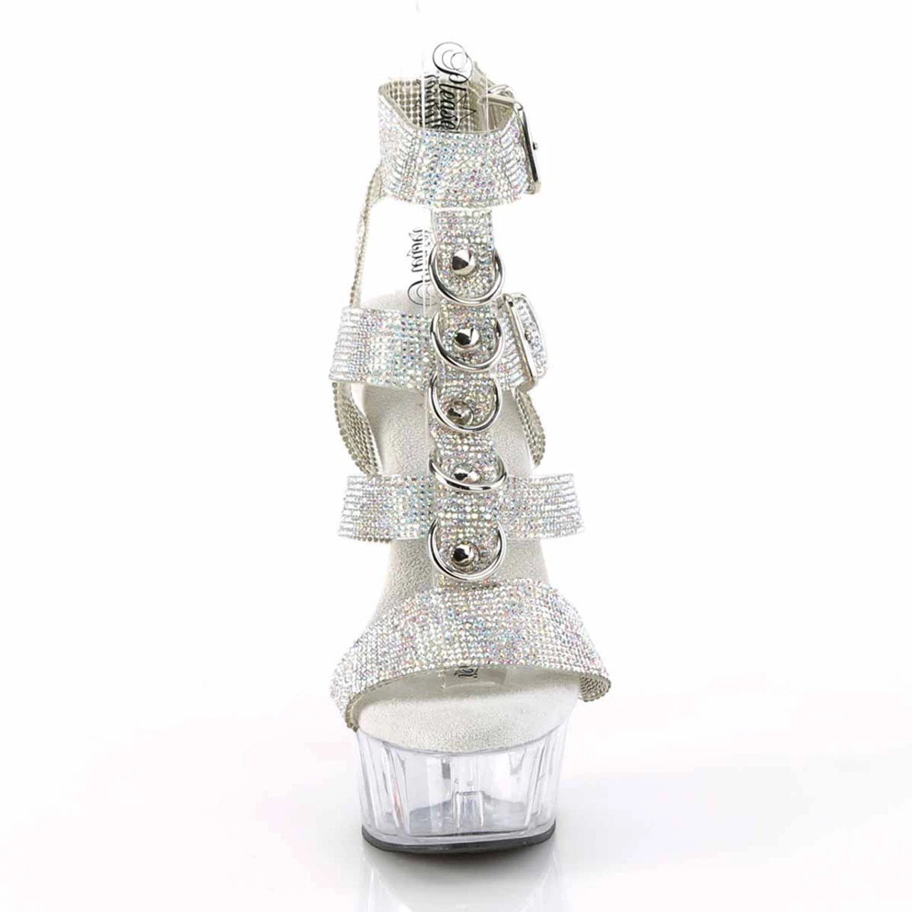 6″ (152mm) Heel, 1 3/4″ (45mm) Platform Rhinestone Embellished Strappy T-Strap Sandal Featuring Two Adjustable Buckle Straps, Cone Studs and Hardware Accents Going Up the Middle of the Shoe