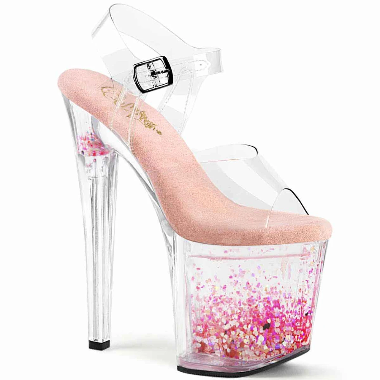 Approximately 8″ (195mm) Heel, 3 3/4″ (95mm) Platform Ankle Strap Sandal w/Prismatic Linear Design at the Platform Front and Back of Heel Featuring the Platform Bottom Infused with Flowing Liquid & Floating Holographic Glitter Hearts