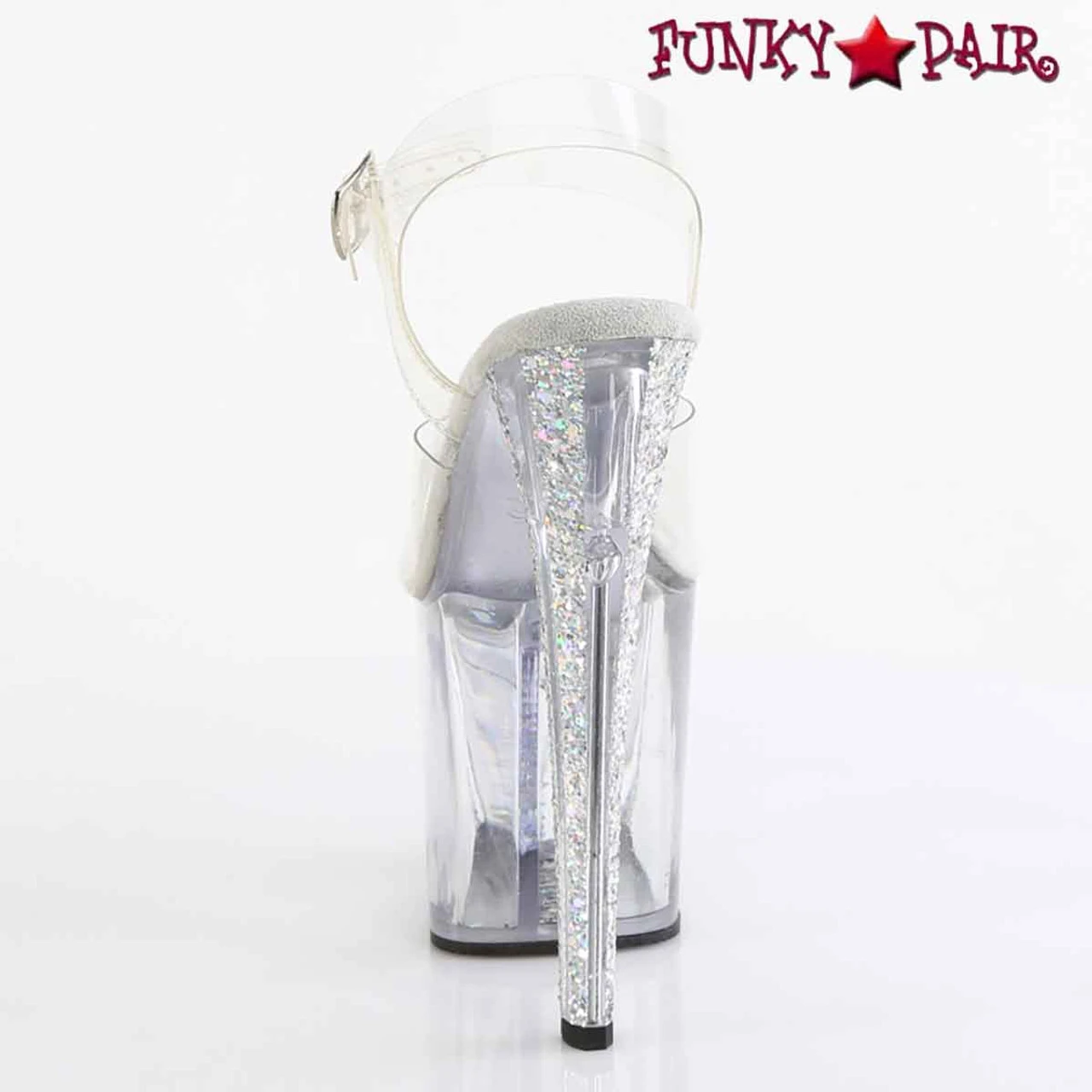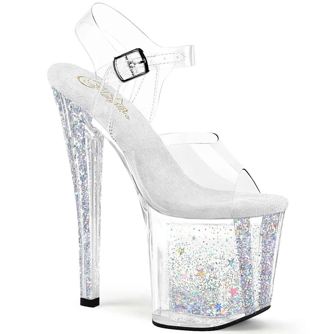 8″ (195mm) Heel, 3 3/4″ (95mm) Clear Platform Ankle Strap Sandal Glittered Prismatic Linear Design at the Platform Front and Back of Heel Featuring the Platform Bottom Infused with Flowing Liquid & Floating Stars & Holographic Glitters