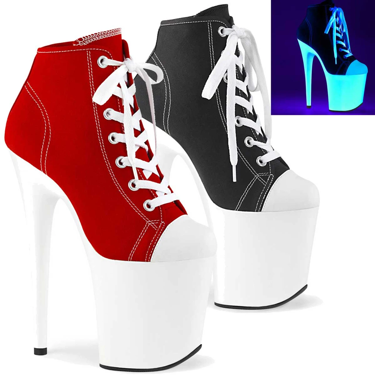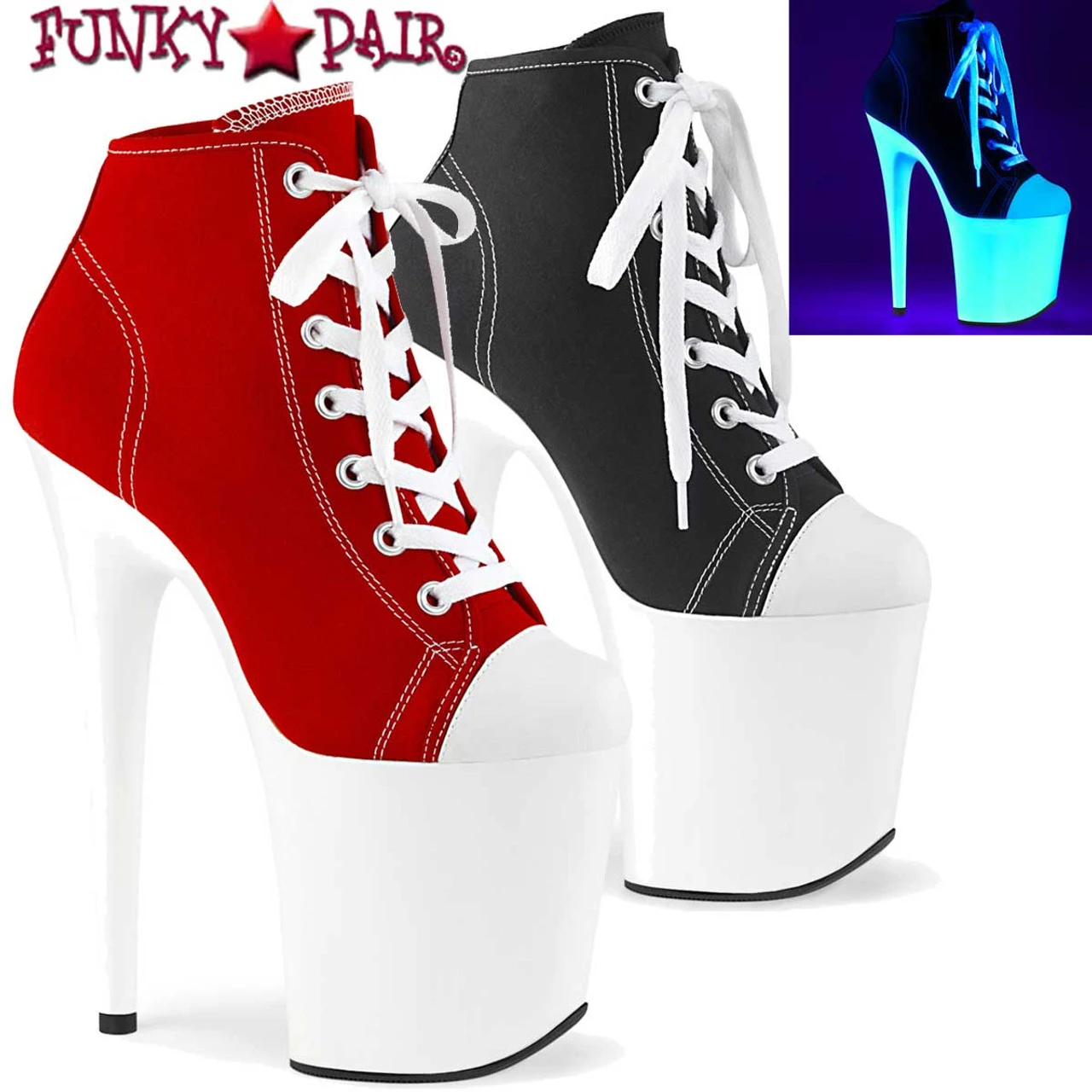 Pleaser Shoes Flamingo-800SK-02, Approximately 8″ (200mm) Heel, 4″ (100mm) Platform Lace Up Front Canvas Sneaker Ankle Boots Featuring Blacklight Reactive Platform Bottom, Outsole & Top lift, Full Inside Zip Closure