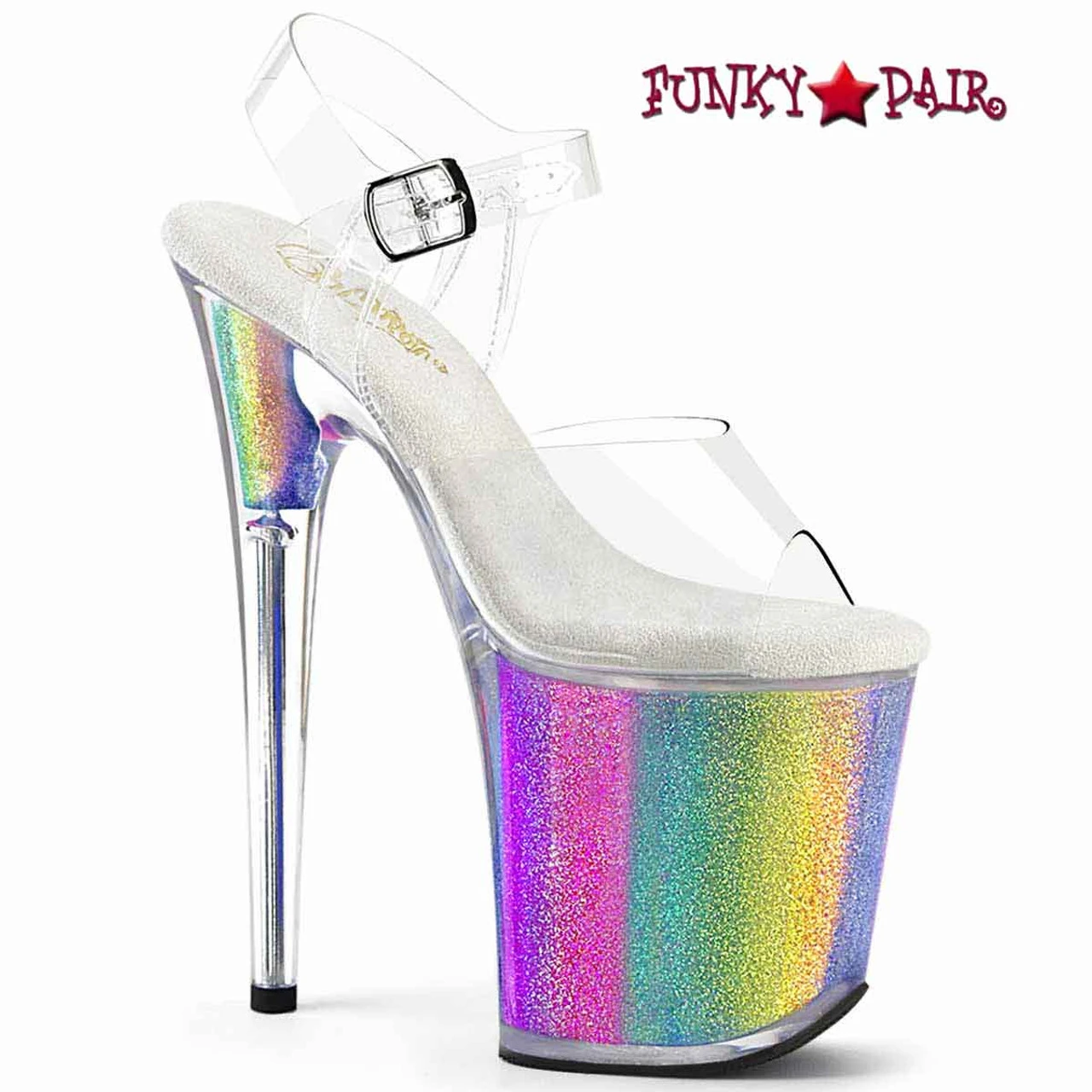 Approximately 8″ (200mm) Heel, 4″ (100mm) Platform Ankle Strap Sandal Featuring UV Blacklight Reactive Rainbow Glitters on the Inside Wall of the Platform Bottom