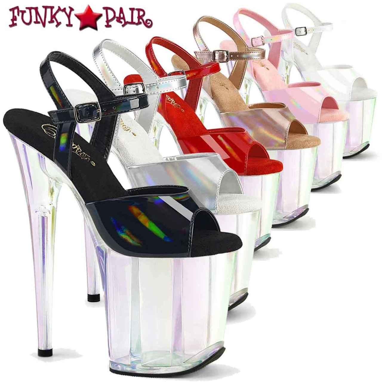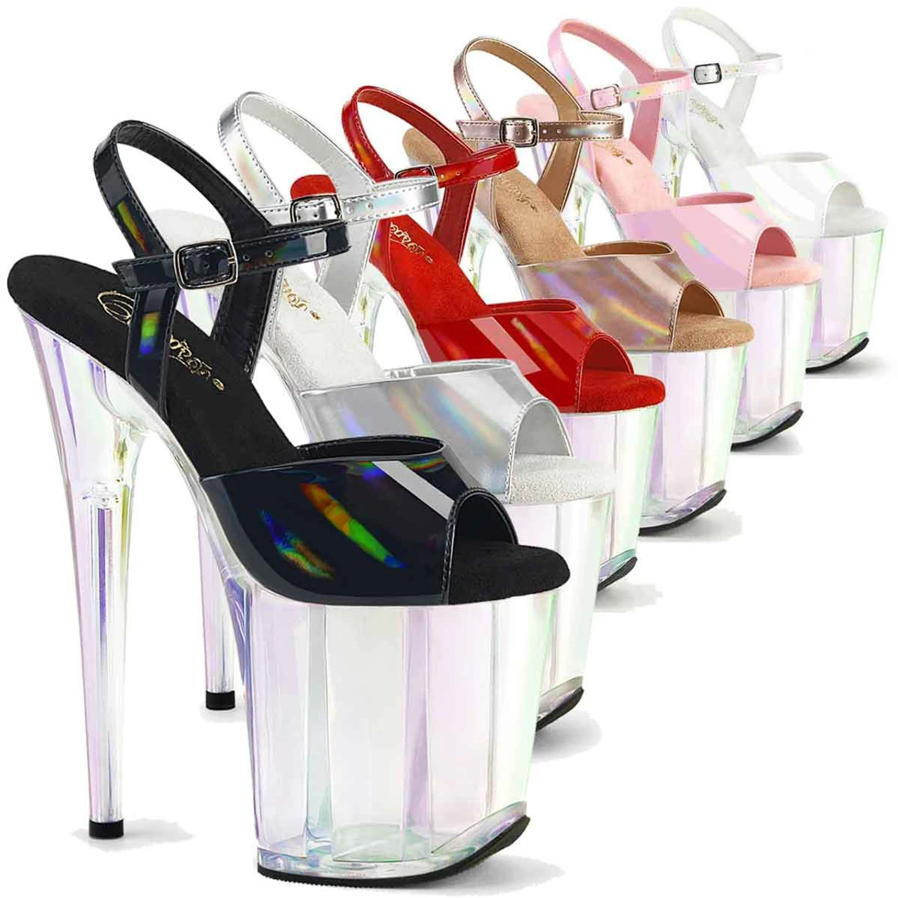 8″ (200mm) Heel, 4″ (100mm) Platform Ankle Strap Sandal Featuring Holographic Tinted Platform Bottom