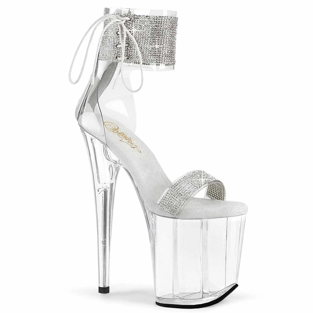 Approximately 8″ (200mm) Heel, 4″ (100mm) Platform Close Back Ankle Cuff Sandal w/Side Lacing Featuring Rhinestone Embellished Ankle Cuff & Toe Strap, Back Zip Closure